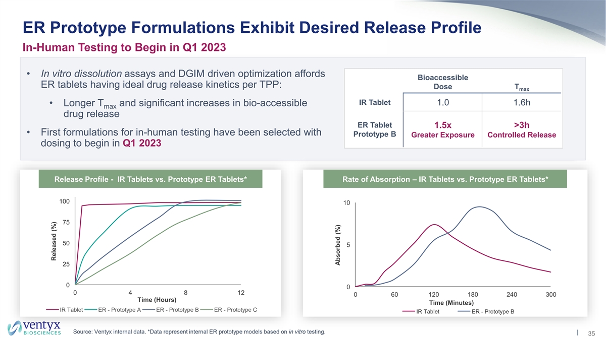 VTX958 ER Tablet Prototypes Developed for Human PK Studies Coupling Static In Vitro Dissolution Assays with Dynamic Modeling for Clinical Formulation Selection Technology 1 Technology 2 Proprietary in vitro Dynamic GI Model • Single tablet QD dissolution assays (DGIM) to evaluate Target Product using human bio- • Maintain class-leading target dissolution profile of Profile relevant media prototypes from coverage as observed in Phase 1 Technology 1 Status and Next Steps • Prototype ER prototype tablets have been engineered to have the desired release profile in nonclinical testing/modeling • First cycle of in-human testing to begin in Q1 2023; expect to provide formulation update ~mid 2023 • Manufacturing for Phase 3 studies to begin in H2 2023 34
