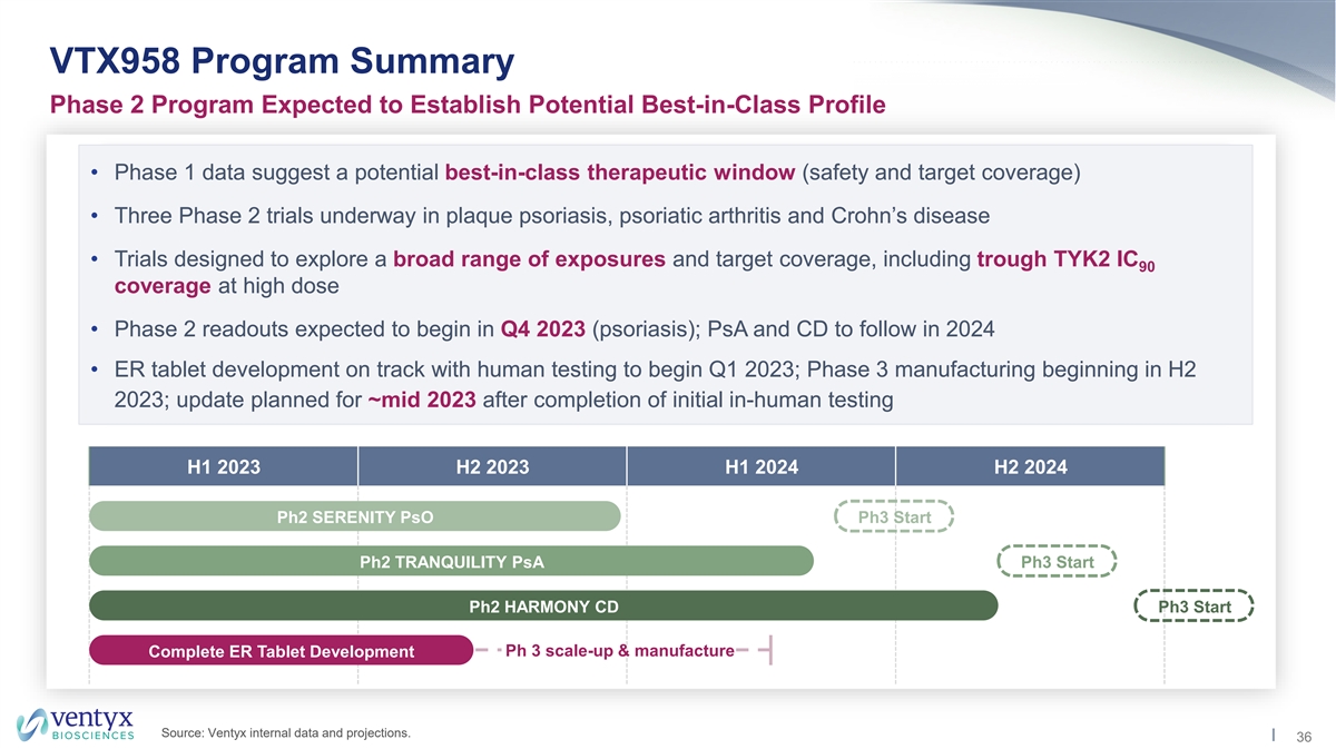 VTX958 Program Summary Phase 2 Program Expected to Establish Potential Best-in-Class Profile • Phase 1 data suggest a potential best-in-class therapeutic window (safety and target coverage) • Three Phase 2 trials underway in plaque psoriasis, psoriatic arthritis and Crohn’s disease • Trials designed to explore a broad range of exposures and target coverage, including trough TYK2 IC 90 coverage at high dose • Phase 2 readouts expected to begin in Q4 2023 (psoriasis); PsA and CD to follow in 2024 • ER tablet development on track with human testing to begin Q1 2023; Phase 3 manufacturing beginning in H2 2023; update planned for ~mid 2023 after completion of initial in-human testing H1 2023 H2 2023 H1 2024 H2 2024 Ph2 SERENITY PsO Ph3 Start Ph2 TRANQUILITY PsA Ph3 Start Ph2 HARMONY CD Ph3 Start Ph 3 scale-up & manufacture Complete ER Tablet Development Source: Ventyx internal data and projections. 36