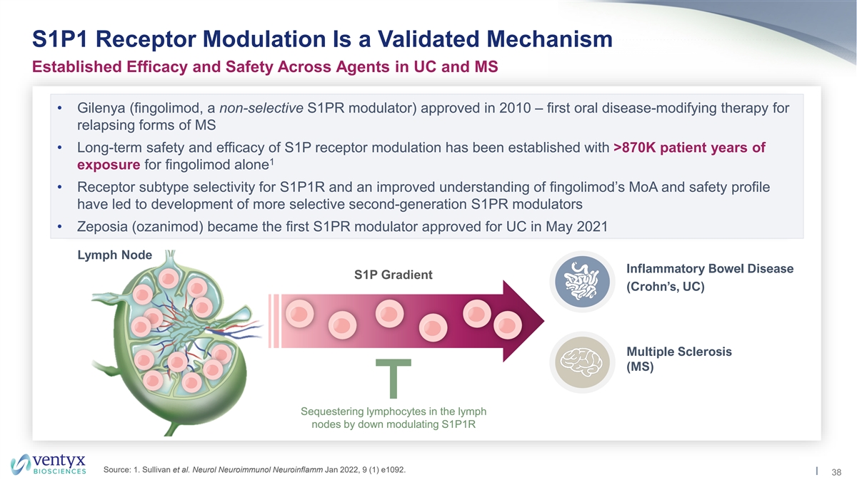 S1P1 Receptor Modulation Is a Validated Mechanism Established Efficacy and Safety Across Agents in UC and MS • Gilenya (fingolimod, a non-selective S1PR modulator) approved in 2010 – first oral disease-modifying therapy for relapsing forms of MS • Long-term safety and efficacy of S1P receptor modulation has been established with >870K patient years of 1 exposure for fingolimod alone • Receptor subtype selectivity for S1P1R and an improved understanding of fingolimod’s MoA and safety profile have led to development of more selective second-generation S1PR modulators • Zeposia (ozanimod) became the first S1PR modulator approved for UC in May 2021 Lymph Node Inflammatory Bowel Disease S1P Gradient (Crohn’s, UC) Multiple Sclerosis (MS) Sequestering lymphocytes in the lymph nodes by down modulating S1P1R Source: 1. Sullivan et al. Neurol Neuroimmunol Neuroinflamm Jan 2022, 9 (1) e1092. 38