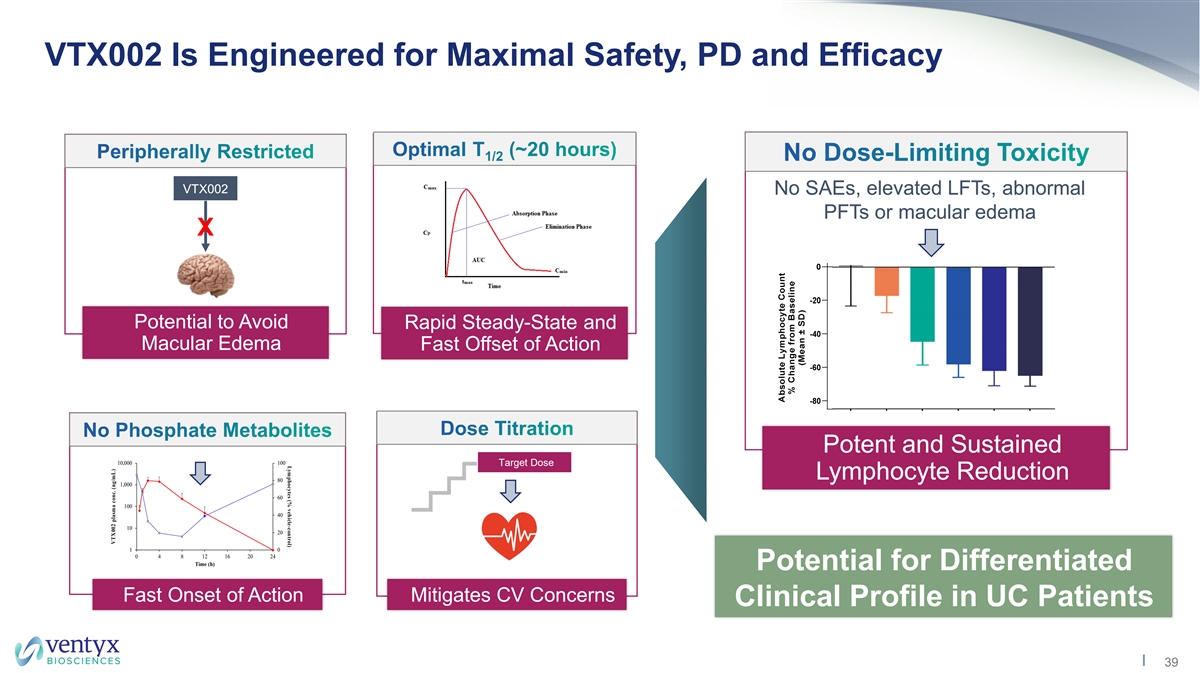 Lymphocytes (% vehicle-control) VTX002 Is Engineered for Maximal Safety, PD and Efficacy VTX002 No SAEs, elevated LFTs, abnormal PFTs or macular edema X Potential to Avoid Rapid Steady-State and Macular Edema Fast Offset of Action Potent and Sustained 10,000 100 Target Dose Lymphocyte Reduction 80 1,000 60 100 40 10 20 1 0 0 4 8 12 16 20 24 Time (h) Potential for Differentiated Fast Onset of Action Mitigates CV Concerns Clinical Profile in UC Patients 39 VTX002 plasma conc. (ng/mL)