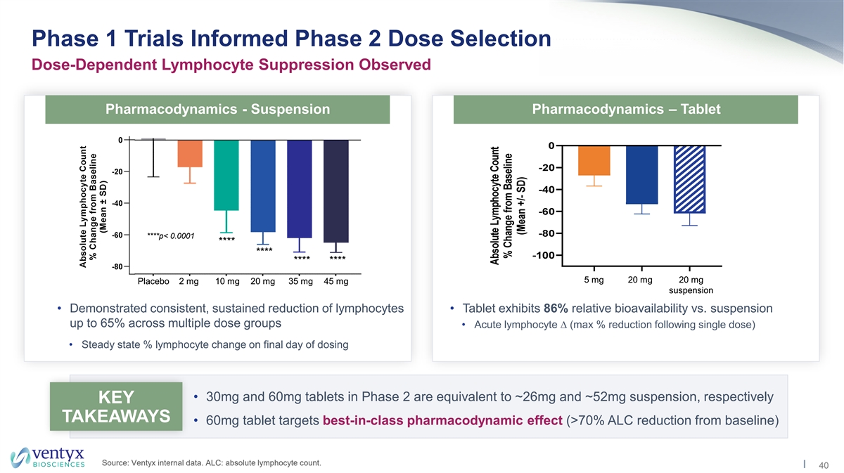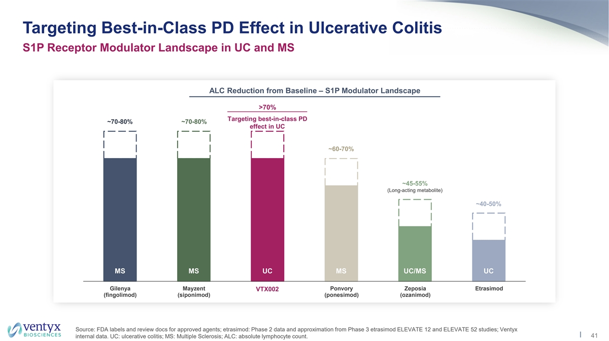 Phase 1 Trials Informed Phase 2 Dose Selection Dose-Dependent Lymphocyte Suppression Observed Pharmacodynamics - Suspension Pharmacodynamics – Tablet ****p< 0.0001 **** **** **** **** 5 mg 20 mg 20 mg Placebo 2 mg 10 mg 20 mg 35 mg 45 mg suspension • Demonstrated consistent, sustained reduction of lymphocytes • Tablet exhibits 86% relative bioavailability vs. suspension up to 65% across multiple dose groups • Acute lymphocyte ∆ (max % reduction following single dose) • Steady state % lymphocyte change on final day of dosing • 30mg and 60mg tablets in Phase 2 are equivalent to ~26mg and ~52mg suspension, respectively KEY TAKEAWAYS • 60mg tablet targets best-in-class pharmacodynamic effect (>70% ALC reduction from baseline) Source: Ventyx internal data. ALC: absolute lymphocyte count. 40
