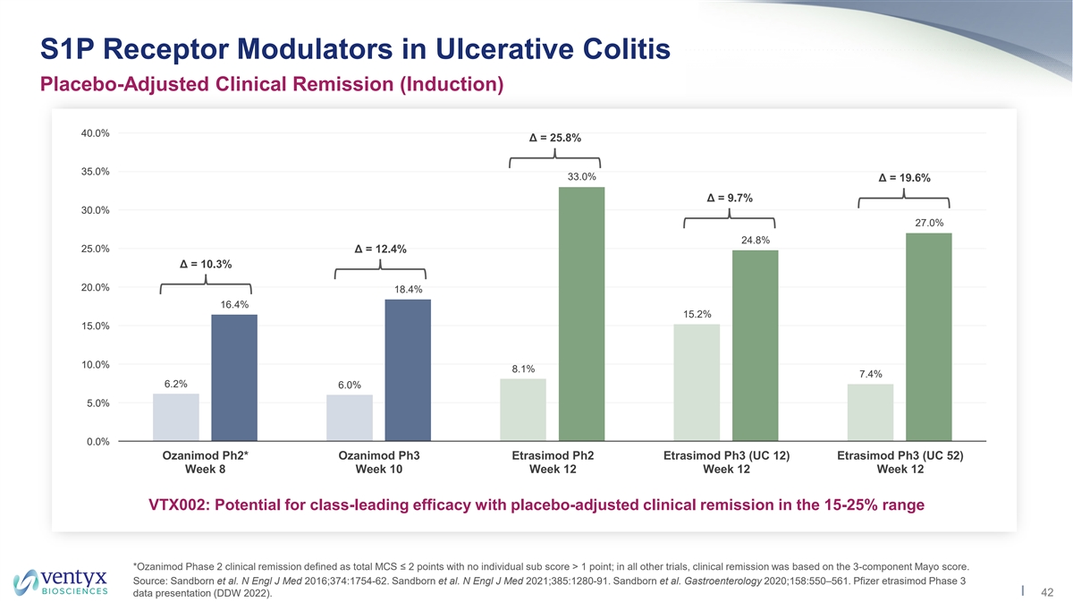 Targeting Best-in-Class PD Effect in Ulcerative Colitis S1P Receptor Modulator Landscape in UC and MS ALC Reduction from Baseline – S1P Modulator Landscape >70% Targeting best-in-class PD ~70-80% ~70-80% effect in UC ~60-70% ~45-55% (Long-acting metabolite) ~40-50% MS MS UC MS UC/MS UC Gilenya Mayzent Ponvory Zeposia Etrasimod VTX002 (fingolimod) (siponimod) (ponesimod) (ozanimod) Source: FDA labels and review docs for approved agents; etrasimod: Phase 2 data and approximation from Phase 3 etrasimod ELEVATE 12 and ELEVATE 52 studies; Ventyx 41 internal data. UC: ulcerative colitis; MS: Multiple Sclerosis; ALC: absolute lymphocyte count.