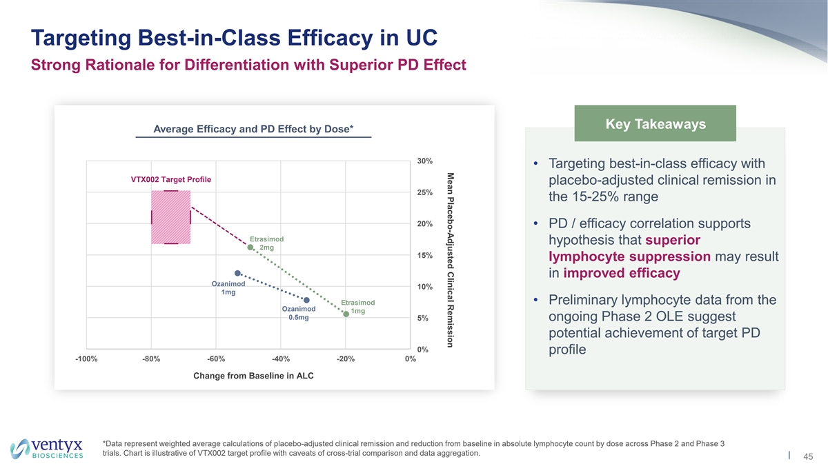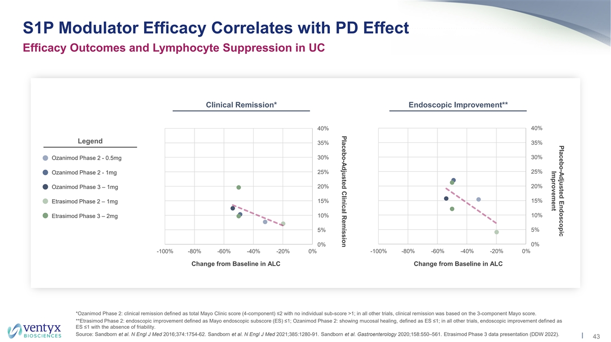 Placebo-Adjusted Endoscopic Improvement % Reduction in New T1 Gd+ Lesions vs Active Comparator S1P Modulator Efficacy Correlates with PD Effect Established Correlation in UC and MS MS – T1 Gd+ Lesions vs. Active Comparator UC – Endoscopic Improvement vs. Placebo* Unexplored in UC 100% 40% 35% 80% 30% 25% 60% 20% 40% 15% 10% 20% 5% 0% 0% -100% -80% -60% -40% -20% 0% -100% -80% -60% -40% -20% 0% Change from Baseline in ALC Change from Baseline in ALC Fingolimod Phase 3 – 0.5mg Ozanimod Phase 3 - 0.5mg Ozanimod Phase 2 - 0.5mg Etrasimod Phase 2 – 1mg Fingolimod Phase 3 – 1.25mg Ozanimod Phase 3 - 1mg Ozanimod Phase 2 - 1mg Etrasimod Phase 3 – 2mg Legend Legend Ponesimod Phase 3 – 20mg Ozanimod Phase 3 – 1mg *Etrasimod Phase 2: endoscopic improvement defined as Mayo endoscopic sub-score (ES) ≤1; Ozanimod Phase 2: showing mucosal healing, defined as ES ≤1; in all other trials, endoscopic improvement defined as ES ≤1 with the absence of friability. Sources (UC): Sandborn et al. N Engl J Med 2016;374:1754-62. Sandborn et al. N Engl J Med 2021;385:1280-91. Sandborn et al. Gastroenterology 2020;158:550–561. Etrasimod Phase 3 data presentation (DDW 2022). Sources (MS): Cohen et al. N Engl J Med 2010;362:402-15. Cohen et al. Lancet Neurol 2019;18: 1021–33. Comi et al. Lancet Neurol 2019;18: 1009–20 Kappos et al. JAMA Neurol. 2021;78(5):558–567. 44