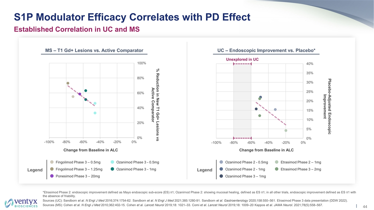 Placebo-Adjusted Endoscopic Improvement Placebo-Adjusted Clinical Remission S1P Modulator Efficacy Correlates with PD Effect Efficacy Outcomes and Lymphocyte Suppression in UC Clinical Remission* Endoscopic Improvement** 40% 40% Legend 35% 35% 30% 30% Ozanimod Phase 2 - 0.5mg 25% 25% Ozanimod Phase 2 - 1mg 20% 20% Ozanimod Phase 3 – 1mg 15% 15% Etrasimod Phase 2 – 1mg 10% 10% Etrasimod Phase 3 – 2mg 5% 5% 0% 0% -100% -80% -60% -40% -20% 0% -100% -80% -60% -40% -20% 0% Change from Baseline in ALC Change from Baseline in ALC *Ozanimod Phase 2: clinical remission defined as total Mayo Clinic score (4-component) ≤2 with no individual sub-score >1; in all other trials, clinical remission was based on the 3-component Mayo score. **Etrasimod Phase 2: endoscopic improvement defined as Mayo endoscopic subscore (ES) ≤1; Ozanimod Phase 2: showing mucosal healing, defined as ES ≤1; in all other trials, endoscopic improvement defined as ES ≤1 with the absence of friability. Source: Sandborn et al. N Engl J Med 2016;374:1754-62. Sandborn et al. N Engl J Med 2021;385:1280-91. Sandborn et al. Gastroenterology 2020;158:550–561. Etrasimod Phase 3 data presentation (DDW 2022). 43