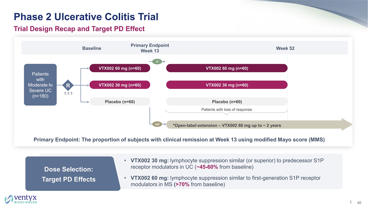 Mean Placebo-Adjusted Clinical Remission Targeting Best-in-Class Efficacy in UC Strong Rationale for Differentiation with Superior PD Effect Key Takeaways Average Efficacy and PD Effect by Dose* 30% • Targeting best-in-class efficacy with VTX002 Target Profile placebo-adjusted clinical remission in 25% the 15-25% range 20% • PD / efficacy correlation supports Etrasimod hypothesis that superior 2mg 15% lymphocyte suppression may result in improved efficacy Ozanimod 10% 1mg Etrasimod • Preliminary lymphocyte data from the Ozanimod 1mg 0.5mg 5% ongoing Phase 2 OLE suggest potential achievement of target PD 0% profile -100% -80% -60% -40% -20% 0% Change from Baseline in ALC *Data represent weighted average calculations of placebo-adjusted clinical remission and reduction from baseline in absolute lymphocyte count by dose across Phase 2 and Phase 3 trials. Chart is illustrative of VTX002 target profile with caveats of cross-trial comparison and data aggregation. 45