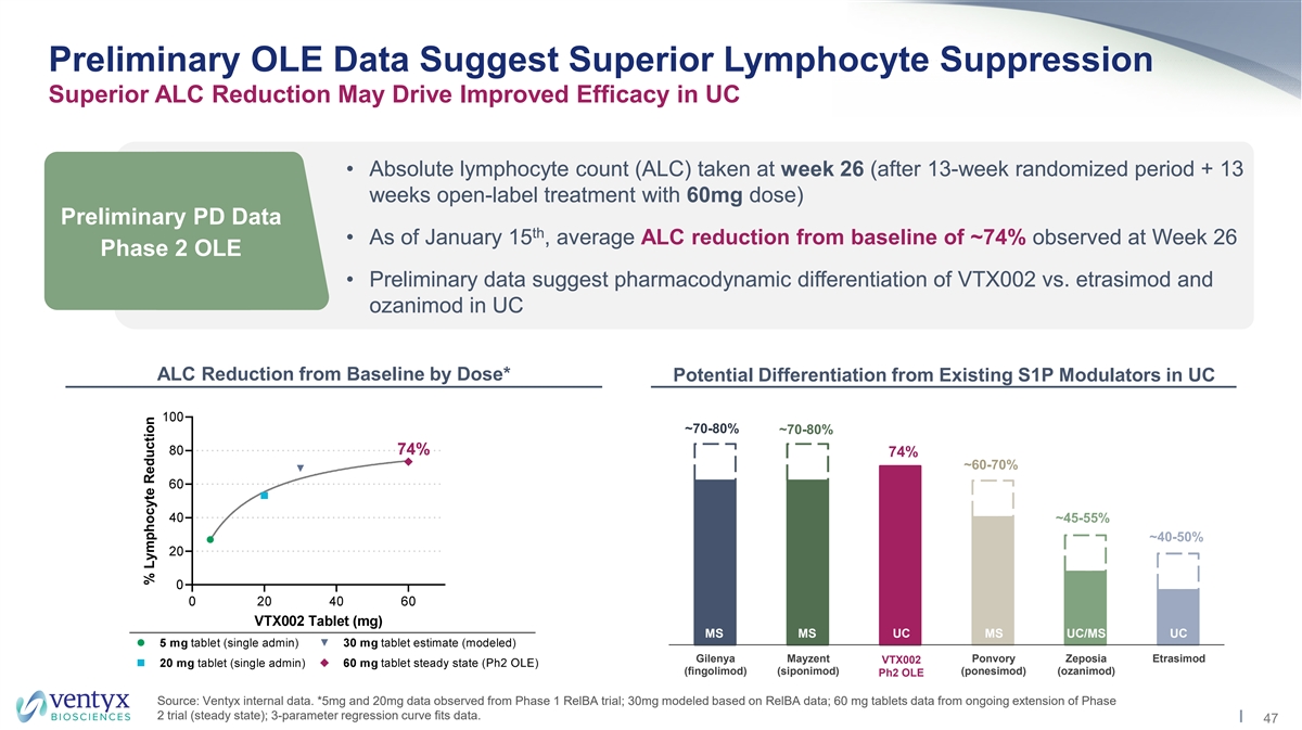 Phase 2 Ulcerative Colitis Trial Trial Design Recap and Target PD Effect Primary Endpoint Baseline Week 52 Week 13 R VTX002 60 mg (n=60) VTX002 60 mg (n=60) Patients with VTX002 30 mg (n=60) VTX002 30 mg (n=60) Moderate to R Severe UC 1:1:1 (n=180) Placebo (n=60) Placebo (n=60) Patients with loss of response NR *Open-label extension – VTX002 60 mg up to ~ 2 years Primary Endpoint: The proportion of subjects with clinical remission at Week 13 using modified Mayo score (MMS) • VTX002 30 mg: lymphocyte suppression similar (or superior) to predecessor S1P receptor modulators in UC (~45-60% from baseline) Dose Selection: • VTX002 60 mg: lymphocyte suppression similar to first-generation S1P receptor Target PD Effects modulators in MS (>70% from baseline) 46