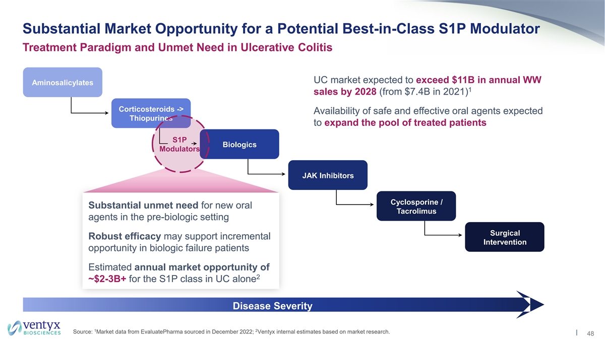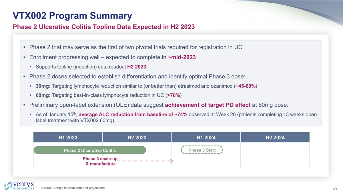 Substantial Market Opportunity for a Potential Best-in-Class S1P Modulator Treatment Paradigm and Unmet Need in Ulcerative Colitis UC market expected to exceed $11B in annual WW Aminosalicylates 1 sales by 2028 (from $7.4B in 2021) Corticosteroids -> Availability of safe and effective oral agents expected Thiopurines to expand the pool of treated patients S1P Biologics Modulators JAK Inhibitors Cyclosporine / Substantial unmet need for new oral Tacrolimus agents in the pre-biologic setting Surgical Robust efficacy may support incremental Intervention opportunity in biologic failure patients Estimated annual market opportunity of 2 ~$2-3B+ for the S1P class in UC alone Disease Severity 1 2 Source: Market data from EvaluatePharma sourced in December 2022; Ventyx internal estimates based on market research. 48