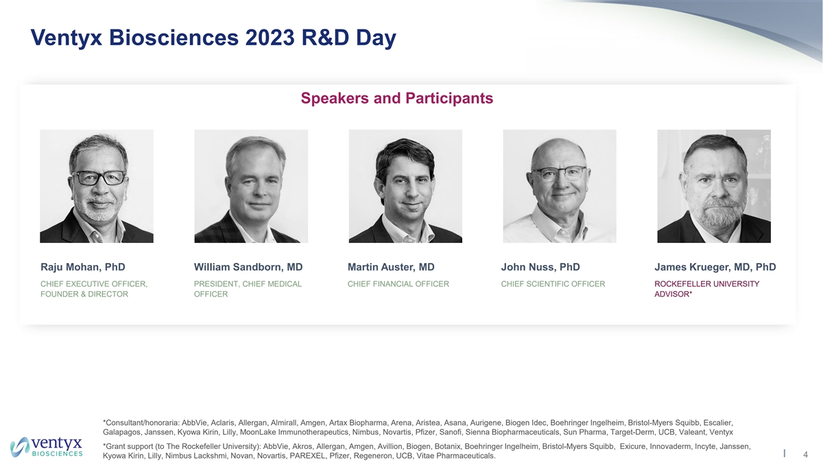 Ventyx Biosciences 2023 R&D Day Speakers and Participants Raju Mohan, PhD William Sandborn, MD Martin Auster, MD John Nuss, PhD James Krueger, MD, PhD CHIEF EXECUTIVE OFFICER, PRESIDENT, CHIEF MEDICAL CHIEF FINANCIAL OFFICER CHIEF SCIENTIFIC OFFICER ROCKEFELLER UNIVERSITY FOUNDER & DIRECTOR OFFICER ADVISOR* *Consultant/honoraria: AbbVie, Aclaris, Allergan, Almirall, Amgen, Artax Biopharma, Arena, Aristea, Asana, Aurigene, Biogen Idec, Boehringer Ingelheim, Bristol-Myers Squibb, Escalier, Galapagos, Janssen, Kyowa Kirin, Lilly, MoonLake Immunotherapeutics, Nimbus, Novartis, Pfizer, Sanofi, Sienna Biopharmaceuticals, Sun Pharma, Target-Derm, UCB, Valeant, Ventyx *Grant support (to The Rockefeller University): AbbVie, Akros, Allergan, Amgen, Avillion, Biogen, Botanix, Boehringer Ingelheim, Bristol-Myers Squibb, Exicure, Innovaderm, Incyte, Janssen, 4 Kyowa Kirin, Lilly, Nimbus Lackshmi, Novan, Novartis, PAREXEL, Pfizer, Regeneron, UCB, Vitae Pharmaceuticals.