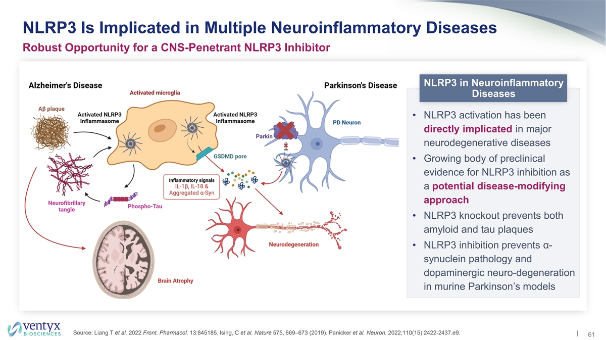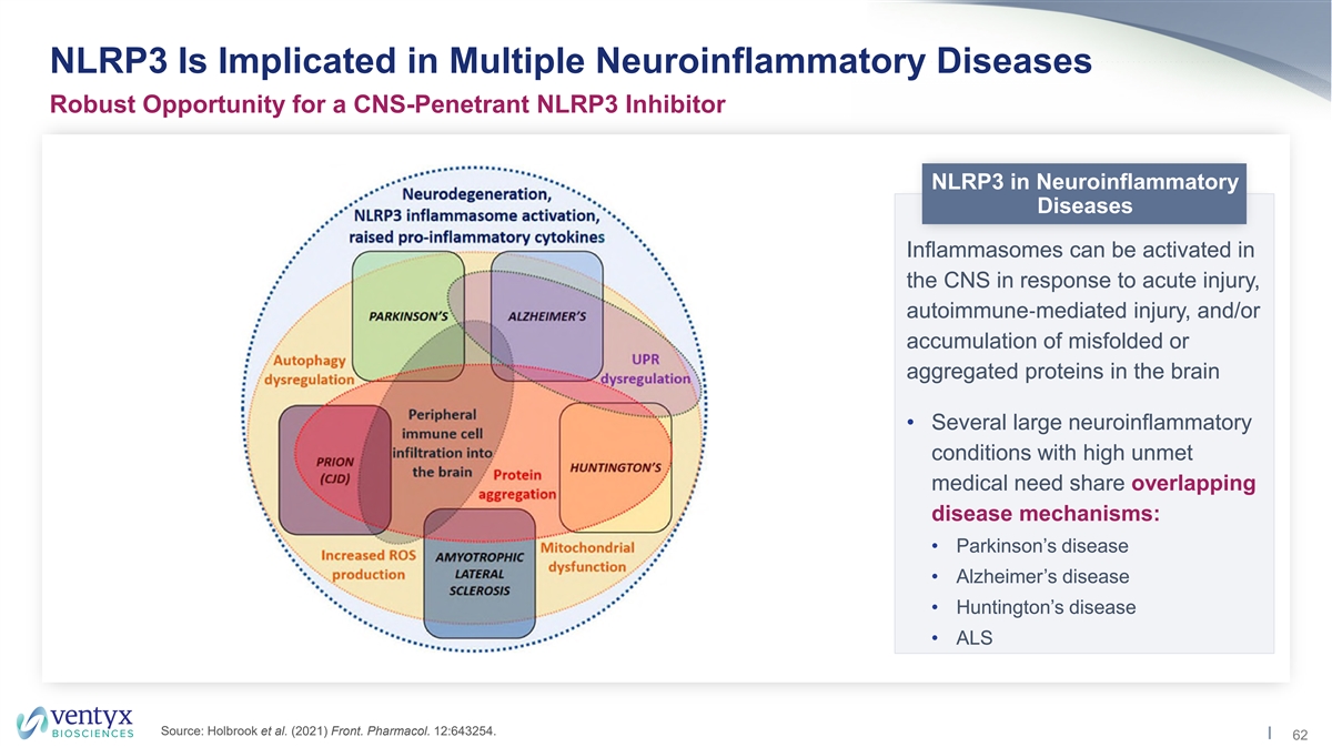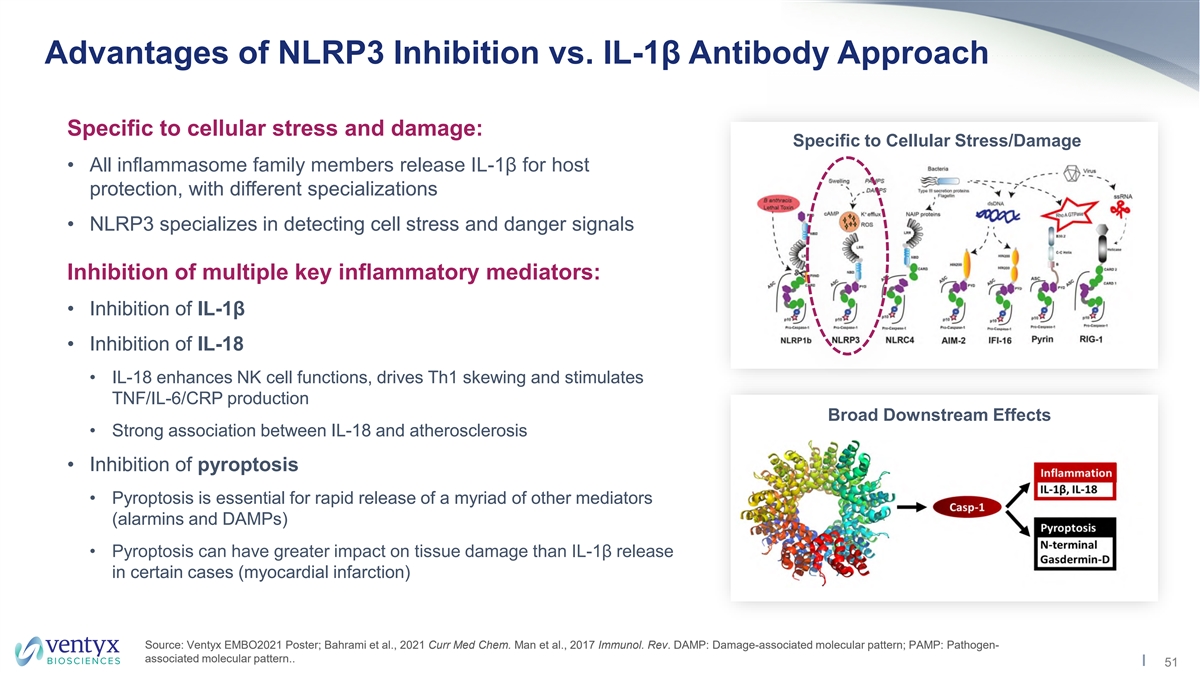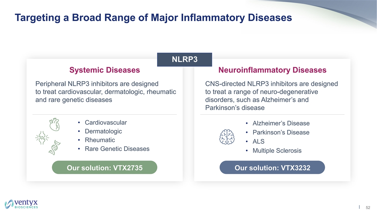 Advantages of NLRP3 Inhibition vs. IL-1β Antibody Approach Specific to cellular stress and damage: Specific to Cellular Stress/Damage • All inflammasome family members release IL-1β for host protection, with different specializations • NLRP3 specializes in detecting cell stress and danger signals Inhibition of multiple key inflammatory mediators: • Inhibition of IL-1β • Inhibition of IL-18 • IL-18 enhances NK cell functions, drives Th1 skewing and stimulates TNF/IL-6/CRP production Broad Downstream Effects • Strong association between IL-18 and atherosclerosis • Inhibition of pyroptosis • Pyroptosis is essential for rapid release of a myriad of other mediators (alarmins and DAMPs) • Pyroptosis can have greater impact on tissue damage than IL-1β release in certain cases (myocardial infarction) Source: Ventyx EMBO2021 Poster; Bahrami et al., 2021 Curr Med Chem. Man et al., 2017 Immunol. Rev. DAMP: Damage-associated molecular pattern; PAMP: Pathogen- associated molecular pattern.. 51