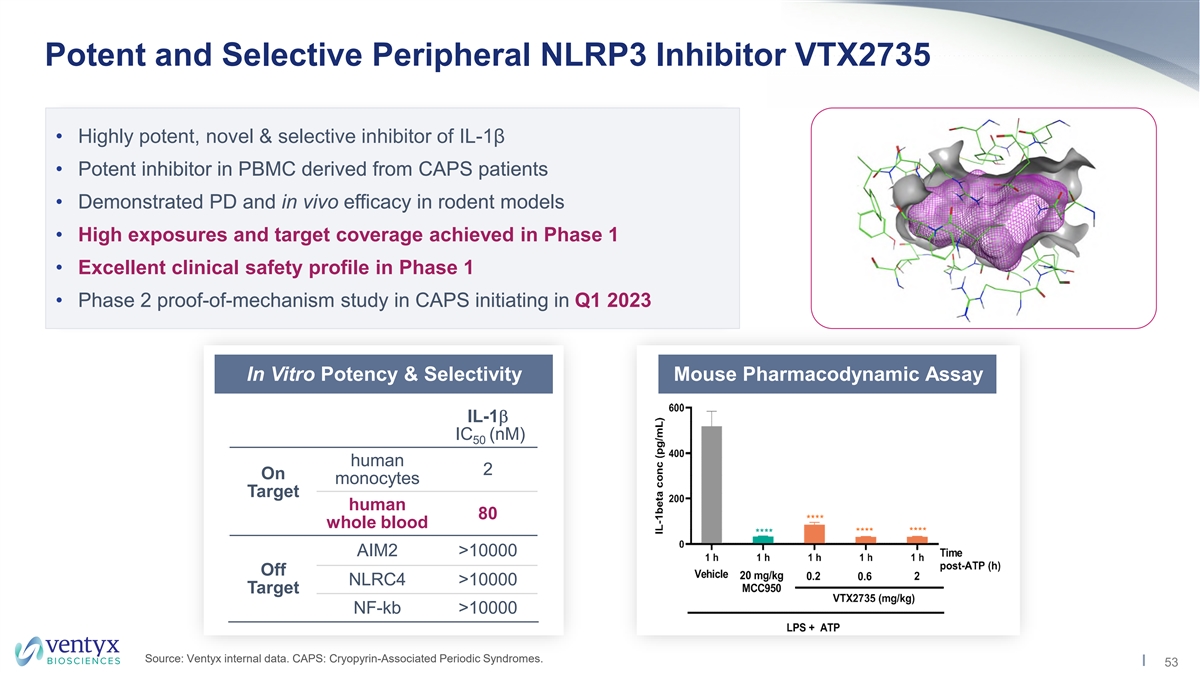Potent and Selective Peripheral NLRP3 Inhibitor VTX2735 • Highly potent, novel & selective inhibitor of IL-1β • Potent inhibitor in PBMC derived from CAPS patients • Demonstrated PD and in vivo efficacy in rodent models • High exposures and target coverage achieved in Phase 1 • Excellent clinical safety profile in Phase 1 • Phase 2 proof-of-mechanism study in CAPS initiating in Q1 2023 In Vitro Potency & Selectivity Mouse Pharmacodynamic Assay IL-1b IC (nM) 50 human 2 On monocytes Target human 80 whole blood AIM2 >10000 Off NLRC4 >10000 Target NF-kb >10000 Source: Ventyx internal data. CAPS: Cryopyrin-Associated Periodic Syndromes. 53