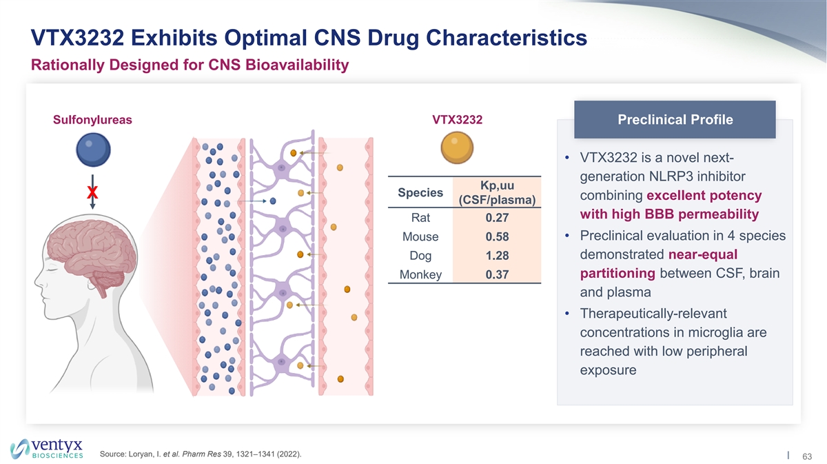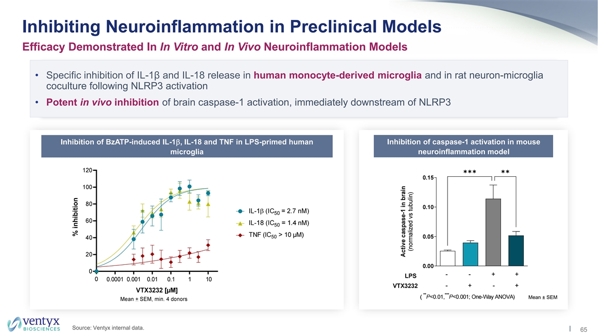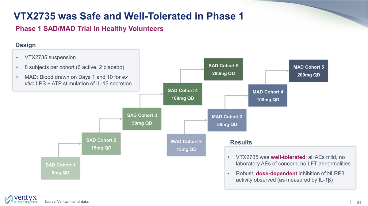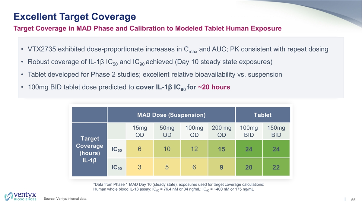 VTX2735 was Safe and Well-Tolerated in Phase 1 Phase 1 SAD/MAD Trial in Healthy Volunteers Design • VTX2735 suspension SAD Cohort 5 MAD Cohort 5 • 8 subjects per cohort (6 active, 2 placebo) 200mg QD 200mg QD • MAD: Blood drawn on Days 1 and 10 for ex vivo LPS + ATP stimulation of IL-1β secretion SAD Cohort 4 MAD Cohort 4 100mg QD 100mg QD SAD Cohort 3 MAD Cohort 3 50mg QD 50mg QD SAD Cohort 2 MAD Cohort 2 Results 15mg QD 15mg QD • VTX2735 was well-tolerated: all AEs mild, no laboratory AEs of concern; no LFT abnormalities SAD Cohort 1 5mg QD • Robust, dose-dependent inhibition of NLRP3 activity observed (as measured by IL-1β) Source: Ventyx internal data. 54
