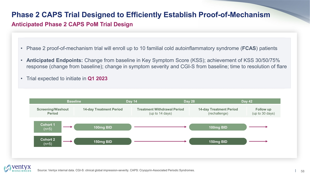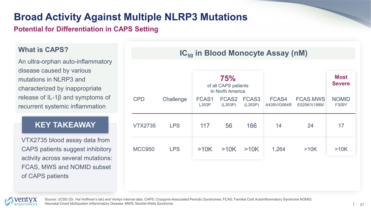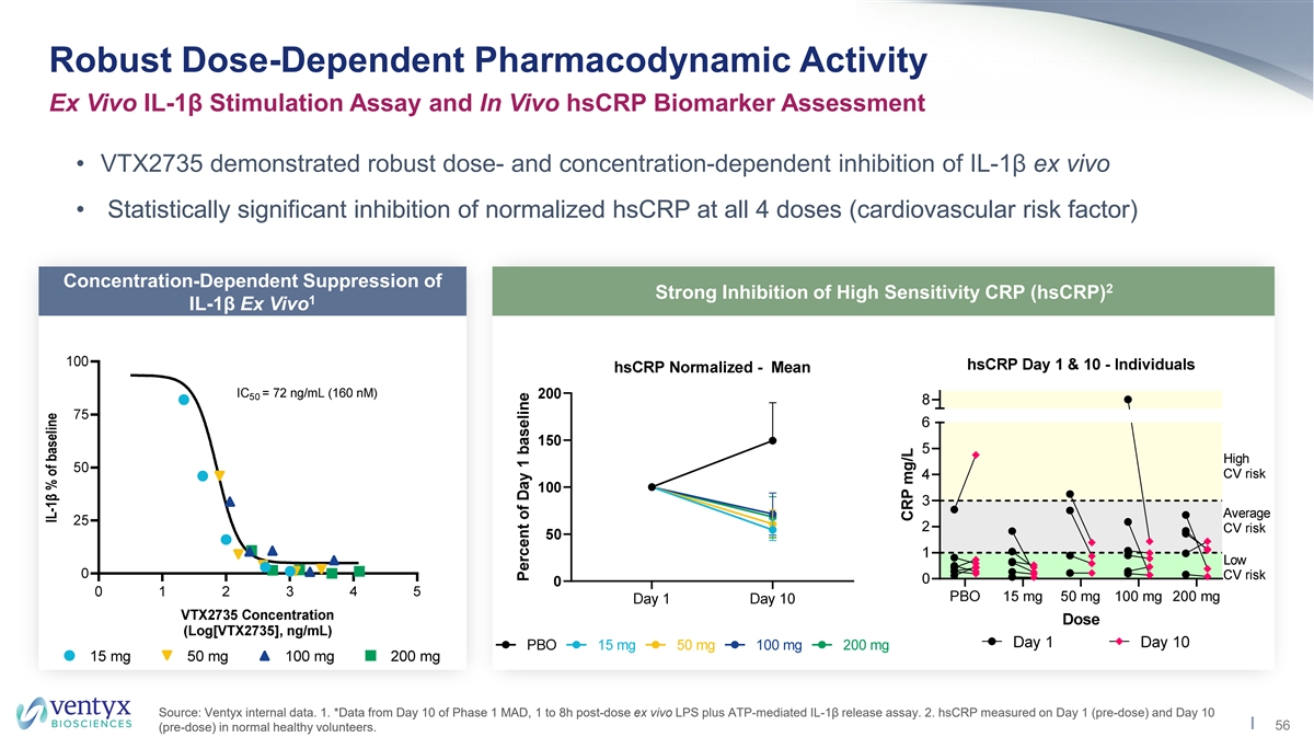 Excellent Target Coverage Target Coverage in MAD Phase and Calibration to Modeled Tablet Human Exposure • VTX2735 exhibited dose-proportionate increases in C and AUC; PK consistent with repeat dosing max • Robust coverage of IL-1β IC and IC achieved (Day 10 steady state exposures) 50 90 • Tablet developed for Phase 2 studies; excellent relative bioavailability vs. suspension • 100mg BID tablet dose predicted to cover IL-1β IC for ~20 hours 90 MAD Dose (Suspension) Tablet 15mg 50mg 100mg 200 mg 100mg 150mg QD QD QD QD BID BID Target Coverage IC 6 10 12 15 24 24 50 (hours) IL-1β IC 3 5 6 9 20 22 90 *Data from Phase 1 MAD Day 10 (steady state); exposures used for target coverage calculations: Human whole blood IL-1β assay: IC = 76.4 nM or 34 ng/mL; IC = ~400 nM or 175 ng/mL 50 90 Source: Ventyx internal data. 55