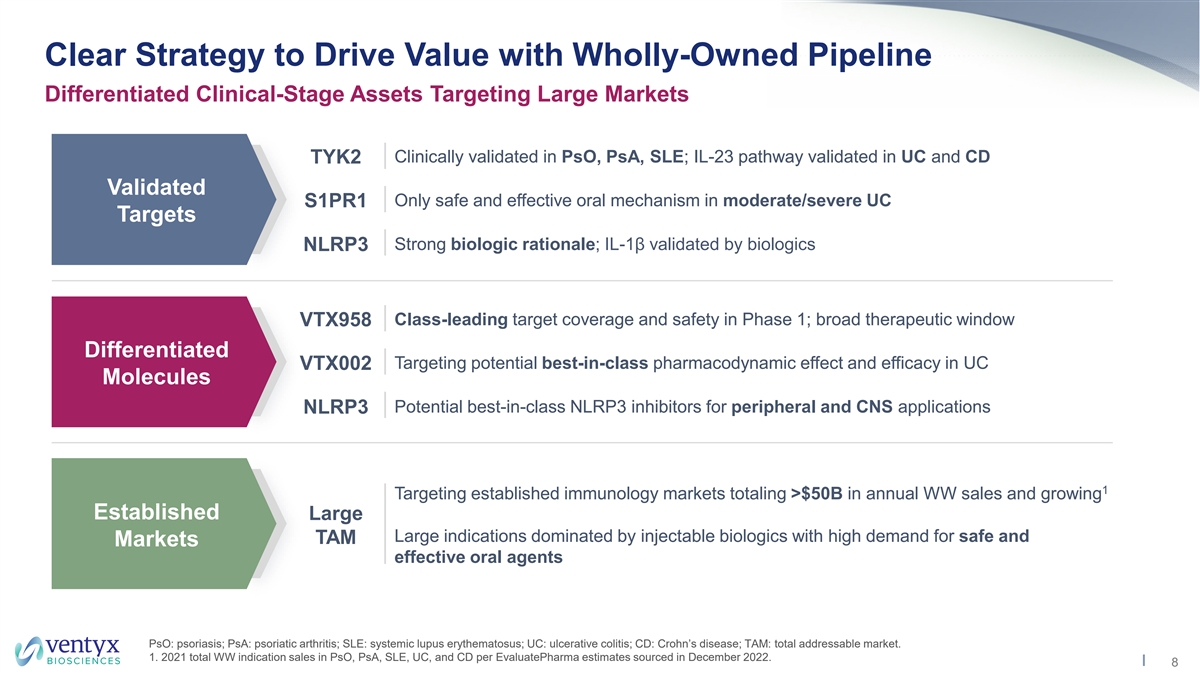 Ventyx’s Chemistry-Driven, Efficient & Productive R&D Engine VTX3232 A wholly-owned clinical portfolio CNS-NLRP3 INHIBITOR VTX2735 Validated Targets NLRP3 Monocyte & Lymphocyte INHIBITOR lymphocyte Egress Discovery Target recruitment Unmet Need Acute Differentiated Molecules inflammatory response Cell death & tissue damage VTX002 T helper S1P1 Discovery Target Improved Safety and Efficacy* MODULATOR IL-4Ra Antagonists Th1/Th17 Th2 Cytokines Cytokines VTX2735 NLRP3 INHIBITOR VTX958 TYK2 INHIBITOR Innate/Adaptive VTX3232 Feed Forward CNS-NLRP3 Chronic inflammatory INHIBITOR Targeting the cycle of chronic inflammation response *Represents target clinical profile for pipeline candidates. 7
