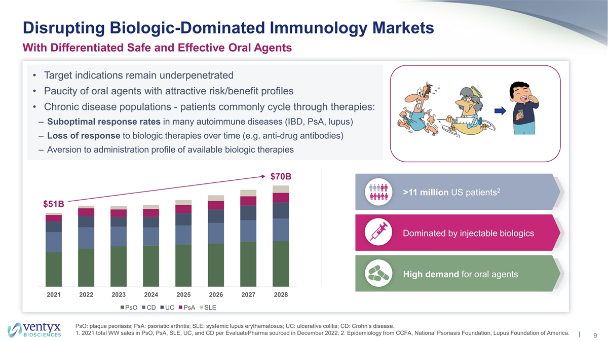 Clear Strategy to Drive Value with Wholly-Owned Pipeline Differentiated Clinical-Stage Assets Targeting Large Markets Clinically validated in PsO, PsA, SLE; IL-23 pathway validated in UC and CD TYK2 Validated Only safe and effective oral mechanism in moderate/severe UC S1PR1 Targets Strong biologic rationale; IL-1β validated by biologics NLRP3 VTX958 Class-leading target coverage and safety in Phase 1; broad therapeutic window Differentiated VTX002 Targeting potential best-in-class pharmacodynamic effect and efficacy in UC Molecules NLRP3 Potential best-in-class NLRP3 inhibitors for peripheral and CNS applications 1 Targeting established immunology markets totaling >$50B in annual WW sales and growing Established Large Large indications dominated by injectable biologics with high demand for safe and TAM Markets effective oral agents PsO: psoriasis; PsA: psoriatic arthritis; SLE: systemic lupus erythematosus; UC: ulcerative colitis; CD: Crohn’s disease; TAM: total addressable market. 1. 2021 total WW indication sales in PsO, PsA, SLE, UC, and CD per EvaluatePharma estimates sourced in December 2022. 8