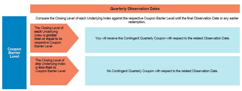 If the Closing Level of each Underlying Index is greater than or equal to its respective Coupon Barrier Level on an Observation Date, we will pay a Contingent Quarterly Coupon of $21.50 per security (equivalent to an annual rate of 8.60%) on the related Coupon Payment Date.