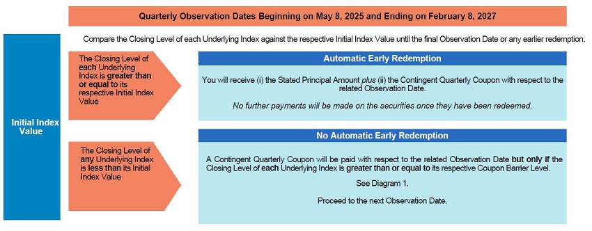 If the Closing Level of each Underlying Index is greater than or equal to its Initial Index Value on any quarterly Observation Date beginning on May 8, 2025 and ending on February 8, 2027, the securities will be automatically redeemed for an Early Redemption Payment equal to the Stated Principal Amount plus the Contingent Quarterly Coupon with respect to the related Observation Date. No further payments will be made on the securities once they have been redeemed.