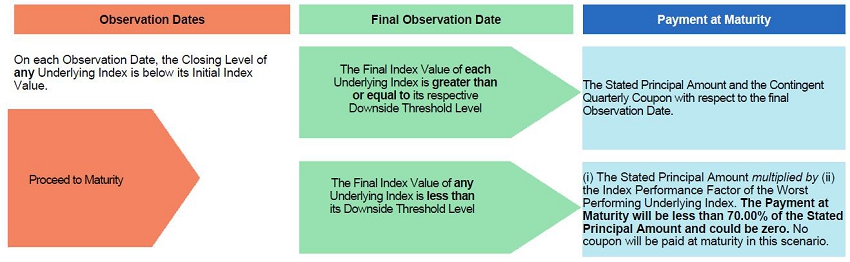 · If the Final Index Value of each Underlying Index is greater than or equal to its respective Downside Threshold Level: the Stated Principal Amount plus the Contingent Quarterly Coupon with respect to the final Observation Date · If the Final Index Value of any Underlying Index is less than its Downside Threshold Level: (i) the Stated Principal Amount multiplied by (ii) the Index Performance Factor of the Worst Performing Underlying Index. Under these circumstances, the Payment at Maturity will be less than 70.00% of the Stated Principal Amount of the securities and could be zero. Even with any Contingent Quarterly Coupons, the return on the securities could be negative. | |