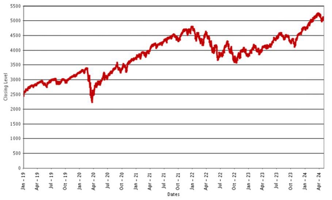 | Second Quarter (through May 1, 2024) | 5,243.77 | 4,967.23 | 5,018.39 |