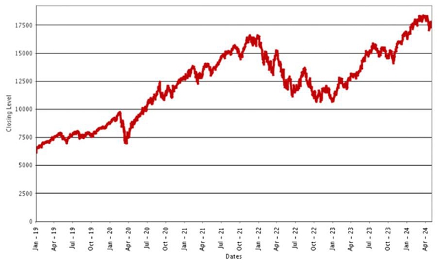 NDX Index Daily Closing Levels January 1, 2019 to May 1, 2024 |