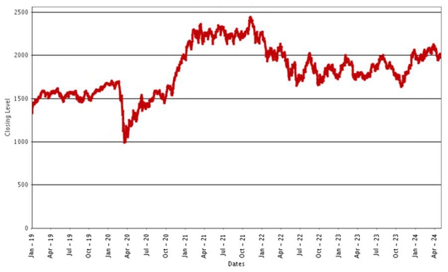 | RTY Index Daily Closing Levels January 1, 2019 to May 1, 2024 |