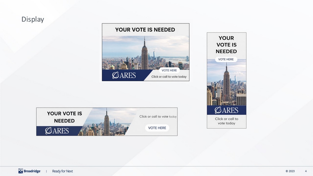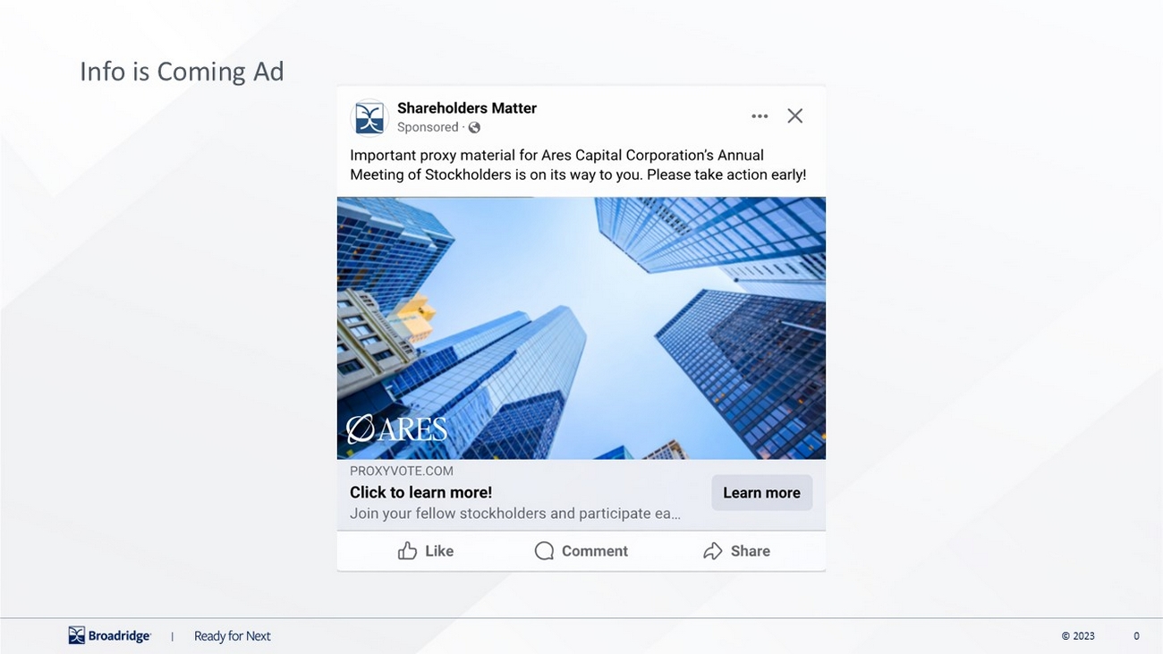 | Your vote is important! Vote your shares today! The Annual Meeting of Stockholders will be held on May 7, 2026. Whether or not you plan to attend, your vote is very important. You can authorize a proxy to vote your shares by internet, telephone, or mail. Simply follow the instructions on the enclosed form. For your convenience, we’ve highlighted where you can find your unique Control Number. WITH A PROXY CARD Call 1-800-690-6903 with a touch-tone phone to vote using an automated system. PHONE WWW.PROXYVOTE.COM Please have your proxy card in hand when accessing the website. There are easy-to-follow directions to help you complete the electronic voting instruction form. ONLINE VOTE PROCESSING Mark, sign and date your ballot and return it in the postage-paid envelope provided. MAIL THREE WAYS TO AUTHORIZE YOUR PROXY 0000 0000 0000 0000 0000 0000 0000 0000 0000 0000 0000 0000 0000 0000 0000 0000 NOTE: This is not an actual Control Number. Please refer to the voting instruction form for your unique Control Number. NOTE: This is not an actual Control Number. Please refer to the proxy card for your unique Control Number. ARES CAPITAL CORPORATION |