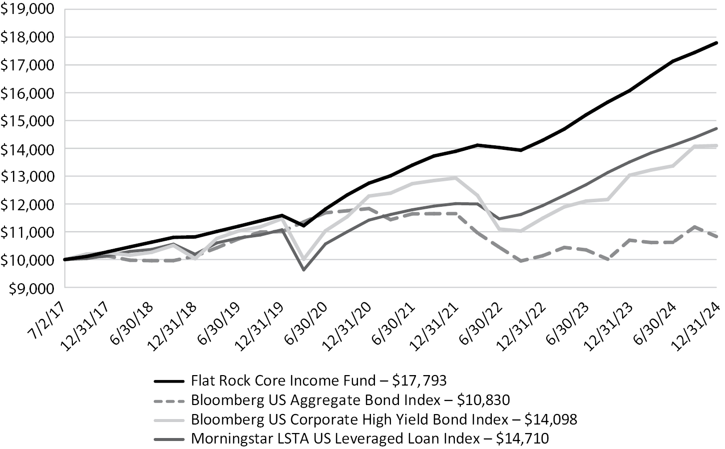 The performance data quoted here represents past performance. Current performance may be lower or higher than the performance quoted above. Investment return and principal value will fluctuate, so that shares, when repurchased by the Fund, may be worth more or less than their original cost. Past performance is no guarantee of future results. The Fund’s performance, especially for very short periods of time, should not be the sole factor in making your investment decisions. All historical performance related to Flat Rock Core Income Fund prior to 11/23/2020 is of the Predecessor Fund, Flat Rock Capital Corp.