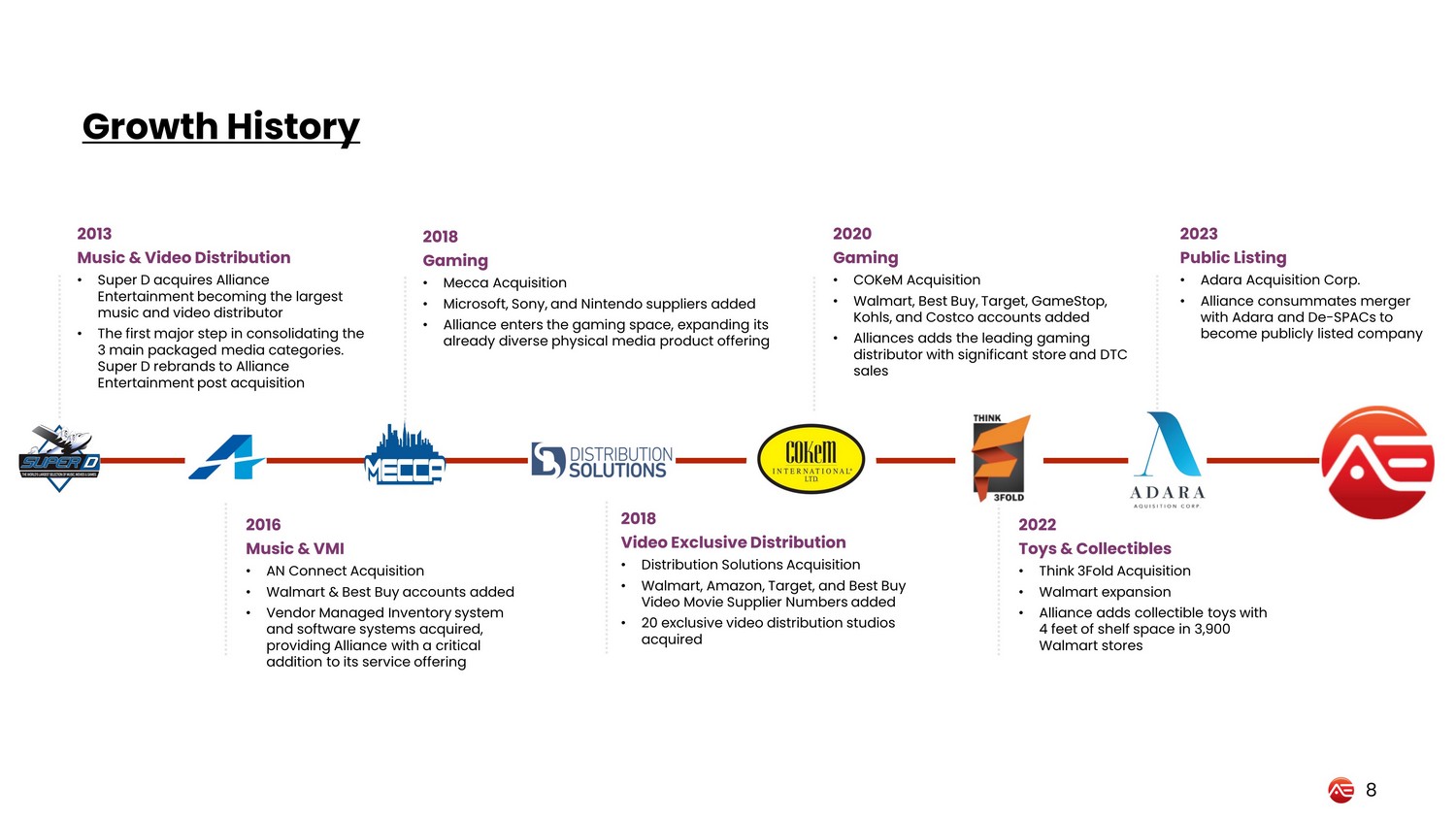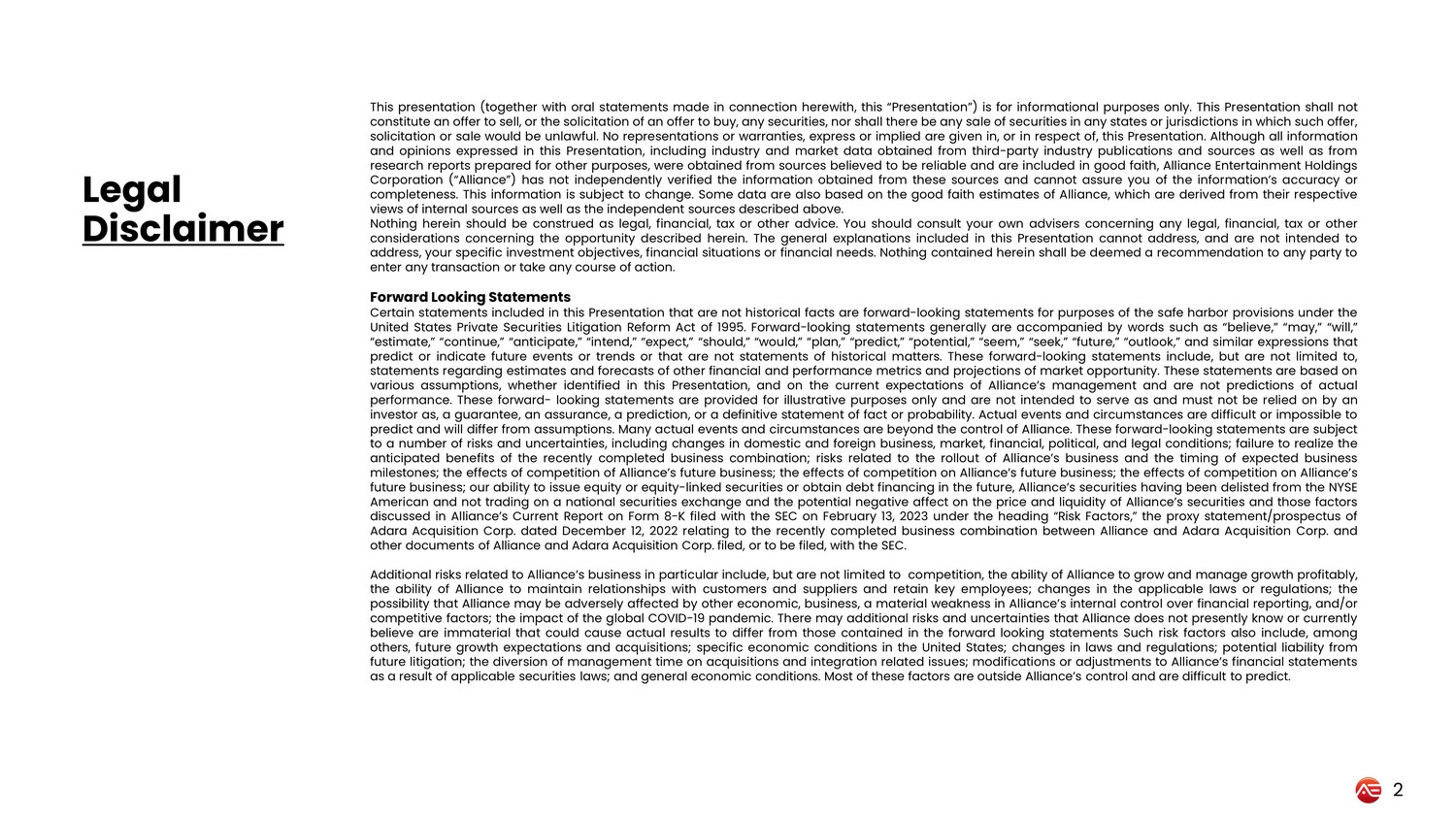 Legal Disclaimer 2 This presentation (together with oral statements made in connection herewith, this “Presentation”) is for informational purposes only . This Presentation shall not constitute an offer to sell, or the solicitation of an offer to buy, any securities, nor shall there be any sale of securities in any states or jurisdictions in which such offer, solicitation or sale would be unlawful . No representations or warranties, express or implied are given in, or in respect of, this Presentation . Although all information and opinions expressed in this Presentation, including industry and market data obtained from third - party industry publications and sources as well as from research reports prepared for other purposes, were obtained from sources believed to be reliable and are included in good faith, Alliance Entertainment Holdings Corporation (“Alliance”) has not independently verified the information obtained from these sources and cannot assure you of the information’s accuracy or completeness . This information is subject to change . Some data are also based on the good faith estimates of Alliance, which are derived from their respective views of internal sources as well as the independent sources described above . Nothing herein should be construed as legal, financial, tax or other advice . You should consult your own advisers concerning any legal, financial, tax or other considerations concerning the opportunity described herein . The general explanations included in this Presentation cannot address, and are not intended to address, your specific investment objectives, financial situations or financial needs . Nothing contained herein shall be deemed a recommendation to any party to enter any transaction or take any course of action . Forward Looking Statements Certain statements included in this Presentation that are not historical facts are forward - looking statements for purposes of the safe harbor provisions under the United States Private Securities Litigation Reform Act of 1995 . Forward - looking statements generally are accompanied by words such as “believe,” “may,” “will,” “estimate,” “continue,” “anticipate,” “intend,” “expect,” “should,” “would,” “plan,” “predict,” “potential,” “seem,” “seek,” “future,” “outlook,” and similar expressions that predict or indicate future events or trends or that are not statements of historical matters . These forward - looking statements include, but are not limited to, statements regarding estimates and forecasts of other financial and performance metrics and projections of market opportunity . These statements are based on various assumptions, whether identified in this Presentation, and on the current expectations of Alliance’s management and are not predictions of actual performance . These forward - looking statements are provided for illustrative purposes only and are not intended to serve as and must not be relied on by an investor as, a guarantee, an assurance, a prediction, or a definitive statement of fact or probability . Actual events and circumstances are difficult or impossible to predict and will differ from assumptions . Many actual events and circumstances are beyond the control of Alliance . These forward - looking statements are subject to a number of risks and uncertainties, including changes in domestic and foreign business, market, financial, political, and legal conditions ; failure to realize the anticipated benefits of the recently completed business combination ; risks related to the rollout of Alliance’s business and the timing of expected business milestones ; the effects of competition of Alliance’s future business ; the effects of competition on Alliance’s future business ; the effects of competition on Alliance’s future business ; our ability to issue equity or equity - linked securities or obtain debt financing in the future, Alliance’s securities having been delisted from the NYSE American and not trading on a national securities exchange and the potential negative affect on the price and liquidity of Alliance’s securities and those factors discussed in Alliance’s Current Report on Form 8 - K filed with the SEC on February 13 , 2023 under the heading “Risk Factors,” the proxy statement/prospectus of Adara Acquisition Corp . dated December 12 , 2022 relating to the recently completed business combination between Alliance and Adara Acquisition Corp . and other documents of Alliance and Adara Acquisition Corp . filed, or to be filed, with the SEC . Additional risks related to Alliance’s business in particular include, but are not limited to competition, the ability of Alliance to grow and manage growth profitably, the ability of Alliance to maintain relationships with customers and suppliers and retain key employees ; changes in the applicable laws or regulations ; the possibility that Alliance may be adversely affected by other economic, business, a material weakness in Alliance’s internal control over financial reporting, and/or competitive factors ; the impact of the global COVID - 19 pandemic . There may additional risks and uncertainties that Alliance does not presently know or currently believe are immaterial that could cause actual results to differ from those contained in the forward looking statements Such risk factors also include, among others, future growth expectations and acquisitions ; specific economic conditions in the United States ; changes in laws and regulations ; potential liability from future litigation ; the diversion of management time on acquisitions and integration related issues ; modifications or adjustments to Alliance’s financial statements as a result of applicable securities laws ; and general economic conditions . Most of these factors are outside Alliance’s control and are difficult to predict .