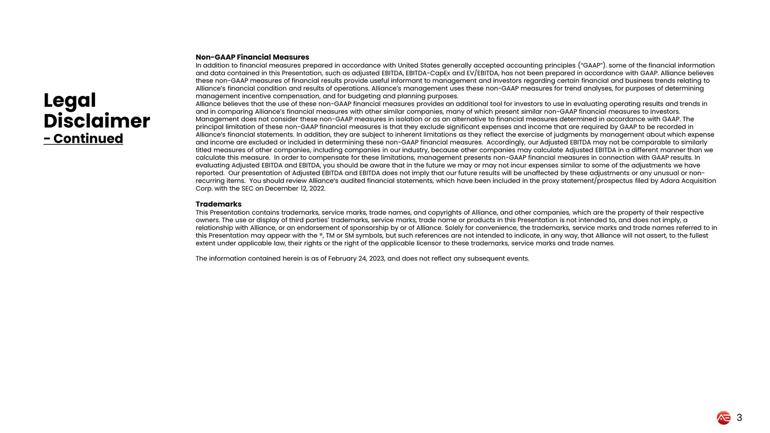 Legal Disclaimer - Continued 3 Non - GAAP Financial Measures In addition to financial measures prepared in accordance with United States generally accepted accounting principles (“GAAP”) . s ome of the financial information and data contained in this Presentation, such as adjusted EBITDA, EBITDA - CapEx and EV/EBITDA, has not been prepared in accordance with GAAP. Alliance believes these non - GAAP measures of financial results provide useful informant to management and investors regarding certain financial an d business trends relating to Alliance’s financial condition and results of operations. Alliance’s management uses these non - GAAP measures for trend analyses, for purposes of determining management incentive compensation, and for budgeting and planning purposes. Alliance believes that the use of these non - GAAP financial measures provides an additional tool for investors to use in evaluati ng operating results and trends in and in comparing Alliance’s financial measures with other similar companies, many of which present similar non - GAAP financial me asures to investors. Management does not consider these non - GAAP measures in isolation or as an alternative to financial measures determined in accor dance with GAAP. The principal limitation of these non - GAAP financial measures is that they exclude significant expenses and income that are required by GAAP to be recorded in Alliance’s financial statements. In addition, they are subject to inherent limitations as they reflect the exercise of judgme nts by management about which expense and income are excluded or included in determining these non - GAAP financial measures. Accordingly, our Adjusted EBITDA may not be comparable to similarly titled measures of other companies, including companies in our industry, because other companies may calculate Adjusted EBITD A i n a different manner than we calculate this measure. In order to compensate for these limitations, management presents non - GAAP financial measures in connec tion with GAAP results. In evaluating Adjusted EBITDA and EBITDA, you should be aware that in the future we may or may not incur expenses similar to som e o f the adjustments we have reported. Our presentation of Adjusted EBITDA and EBITDA does not imply that our future results will be unaffected by these adj ustments or any unusual or non - recurring items. You should review Alliance’s audited financial statements, which have been included in the proxy statement/ pro spectus filed by Adara Acquisition Corp. with the SEC on December 12, 2022. Trademarks This Presentation contains trademarks, service marks, trade names, and copyrights of Alliance, and other companies, which are th e property of their respective owners. The use or display of third parties’ trademarks, service marks, trade name or products in this Presentation is not in ten ded to, and does not imply, a relationship with Alliance, or an endorsement of sponsorship by or of Alliance. Solely for convenience, the trademarks, servi ce marks and trade names referred to in this Presentation may appear with the ®, TM or SM symbols, but such references are not intended to indicate, in any way, that Al liance will not assert, to the fullest extent under applicable law, their rights or the right of the applicable licensor to these trademarks, service marks and trad e n ames. The information contained herein is as of February 24, 2023, and does not reflect any subsequent events.