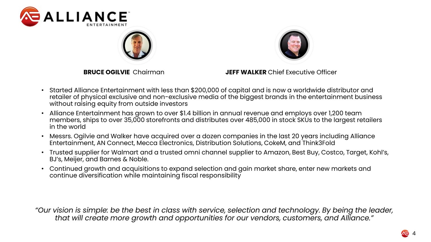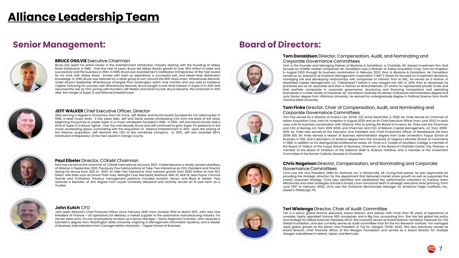 BRUCE OGILVIE Executive Chairman Bruce has spent his entire career in the entertainment distribution industry starting with the founding of Abbey Road Distributors in 1980 . Over the next 14 years, Bruce led Abbey Road’s growth to over $ 94 million in sales and successfully sold the business in 1994 . In 1995 , Bruce was awarded E&Y’s Distribution Entrepreneur of the Year Award for his work with Abbey Road . Armed with start - up experience, a successful exit, and street - level distribution knowledge, in 1996 , Bruce was selected by a bank group to turn around the 600 - store chain, Wherehouse Records . Under Bruce’s leadership Wherehouse emerged from bankruptcy within nine months and was sold to Cerberus Capital . Following his success with Wherehouse Records, Bruce bought a one - third interest in Super D in 2001 and assumed the role as CEO, joining with founders Jeff Walker and David Hurwitz . Bruce became the Chairman in 2013 after the merger of Super D and Alliance Entertainment . Tom Finke Director, Chair of Compensation, Audit, and Nominating and Corporate Governance Committees Tom has served as a director of Invesco Ltd . (NYSE : IVZ) since December 3 , 2020 . Mr . Finke served as Chairman of Adara Acquisition Corp . from its inception in August 2020 and as its Chief Executive Officer from June 2022 , in each case until its business combination with Alliance . Prior to joining the Board of Invesco, Mr . Finke was the Chairman and CEO of Barings LLC from 2016 - 2020 , and Chairman and CEO of Babson Capital Management, LLC from 2008 - 2016 . Mr . Finke also served as the Executive Vice President and Chief Investment Officer of MassMutual Life from 2008 - 2011 . Mr . Finke earned a Master of Business Administration degree from Duke University’s Fuqua School of Business in 1991 , and a Bachelor’s of Science degree from the University of Virginia’s McIntire School of Commerce in 1986 . In addition to his distinguished professional career, Mr . Finke is a Trustee of Davidson College, a member of the Board of Visitors of the Fuqua School of Business, Chairman of the Board of Charlotte Center City Partners, a member of the Board of Directors of the National Math & Science Initiative, and a member of the Investment Committee of the Roman Catholic Diocese of Charlotte . Alliance Leadership Team 7 JEFF WALKER Chief Executive Officer, Director After earning a degree in Economics from UC Irvine, Jeff Walker and David Hurwitz founded the CD Listening Bar in 1990 , a retail music store . A few years later, Jeff and David started wholesaling CDs from the back of the store, beginning the journey to create Super D, a music wholesaler founded in 1995 . In 2001 , Jeff and David Hurwitz sold a third of Super D to Bruce Ogilvie . Over the next decade, Bruce and Jeff continued to grow Super D’s presence in the music wholesaling space, culminating with the acquisition of Alliance Entertainment in 2013 . Upon the closing of the Alliance acquisition, Jeff became the CEO of the combined company . In 2015 , Jeff was awarded E&Y’s Distribution Entrepreneur of the Year award in Orange County . Tom Donaldson Director, Compensation, Audit, and Nominating and Corporate Governance Committees Tom is the Founder and Managing Partner of Blystone & Donaldson, a Charlotte, NC - based investment firm that focuses on middle - market companies . Mr . Donaldson was a director of Adara Acquisition Corp . from its inception in August 2020 through its business combination in February 2023 . Prior to Blystone & Donaldson, Mr . Donaldson served as an executive at Investors Management Corporation (“IMC”) where he focused on investment decisions, managing risk and developing relationships with companies of interest . Prior to IMC, he served as a Partner of Morehead Capital Management, LLC (“Morehead”) before it was merged into IMC in 2016 . Prior to Morehead, he practiced law as an associate and then a Partner at McGuireWoods LLP where he represented private funds and their portfolio companies in corporate governance, structuring and financing transactions and operating businesses in a wide variety of industries . Mr . Donaldson received his Master of Business Administration degree and Juris Doctor degree from Villanova University . He earned his undergraduate degree in Political Science from North Carolina State University . Teri Wielenga Director, Chair of Audit Committee Teri is a senior global finance executive, board director, and advisor with more than 30 years of experience at complex, highly regulated Fortune 500 companies and a Big Four accounting firm . She has led global tax policy and strategy for Gilead Sciences (Nasdaq : GILD) . She currently serves as board director, secretary, treasurer for The Gilead Foundation, and also currently serves as audit committee chair for the Arc Research Institute . Teri managed rapid global growth as the Senior Vice President of Tax for Allergan (NYSE : AGN) . She also previously served as board director, chief financial officer of the Allergan Foundation and served as a board director for multiple Allergan subsidiaries in Ireland, Japan, and Bermuda . Chris Nagelson Director, Compensation, and Nominating and Corporate Governance Committees Chris was the Vice President, DMM for Walmart, Inc . in Bentonville, AR . During that period, he was responsible for providing the strategic direction for the department that delivered market share growth as well as supported the overall corporate strategy . Chris also identified and established key performance indicators to improve team efficiencies and sales strategies and led a broad, cross - functional team in strategic executive - level planning . From June 1997 to February 2005 , Chris was the Divisional Merchandise Manager for American Eagle Outfitters, Inc . , based in Pittsburgh, PA . Paul Eibeler Director, COKeM Chairman Paul has served as the chairman of COKeM International Ltd since 2007 . CokeM became a wholl