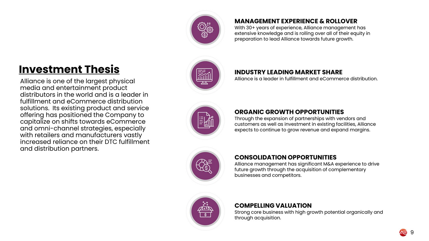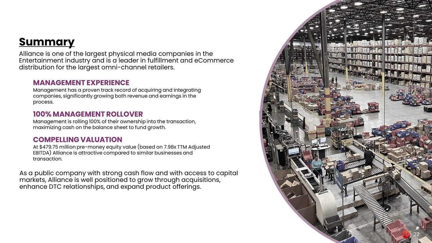 Summary Alliance is one of the largest physical media companies in the Entertainment industry and is a leader in fulfillment and eCommerce distribution for the largest omni - channel retailers. MANAGEMENT EXPERIENCE Management has a proven track record of acquiring and integrating companies, significantly growing both revenue and earnings in the process. 100 % MANAGEMENT ROLLOVER Management is rolling 100% of their ownership into the transaction, maximizing cash on the balance sheet to fund growth. COMPELLING VALUATION At $479.75 million pre - money equity value (based on 7.98x TTM Adjusted EBITDA) Alliance is attractive compared to similar businesses and transaction. As a public company with strong cash flow and with access to capital markets, Alliance is well positioned to grow through acquisitions, enhance DTC relationships, and expand product offerings. 22
