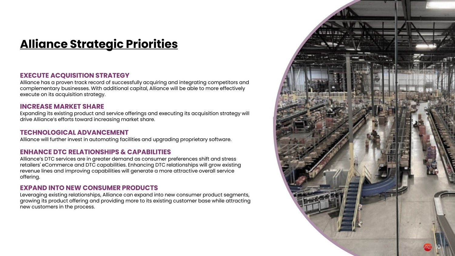 9 Investment Thesis Alliance is one of the largest physical media and entertainment product distributors in the world and is a leader in fulfillment and eCommerce distribution solutions. Its existing product and service offering has positioned the Company to capitalize on shifts towards eCommerce and omni - channel strategies, especially with retailers and manufacturers vastly increased reliance on their DTC fulfillment and distribution partners. MANAGEMENT EXPERIENCE & ROLLOVER With 30+ years of experience, Alliance management has extensive knowledge and is rolling over all of their equity in preparation to lead Alliance towards future growth. INDUSTRY LEADING MARKET SHARE Alliance is a leader in fulfillment and eCommerce distribution. ORGANIC GROWTH OPPORTUNITIES Through the expansion of partnerships with vendors and customers as well as investment in existing facilities, Alliance expects to continue to grow revenue and expand margins. CONSOLIDATION OPPORTUNITIES Alliance management has significant M&A experience to drive future growth through the acquisition of complementary businesses and competitors. COMPELLING VALUATION Strong core business with high growth potential organically and through acquisition.