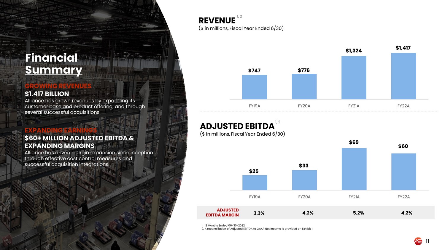 FY19A FY20A FY21A FY22A Financial Summary REVENUE ($ in millions, Fiscal Year Ended 6/30) ADJUSTED EBITDA ($ in millions, Fiscal Year Ended 6/30) $747 $776 $1,324 $1,417 $25 $33 $69 $60 ADJUSTED EBITDA MARGIN 3.3% 4.2% 5.2% 4.2% GROWING REVENUES $1.417 BILLION Alliance has grown revenues by expanding its customer base and product offering, and through several successful acquisitions. EXPANDING EARNINGS $60+ MILLION ADJUSTED EBITDA & EXPANDING MARGINS Alliance has driven margin expansion since inception through effective cost control measures and successful acquisition integrations. 1. 12 Months Ended 06 - 30 - 2022 2. A reconciliation of Adjusted EBITDA to GAAP Net Income is provided on Exhibit 1. 1, 2 1, 2 11 FY19A FY20A FY21A FY22A