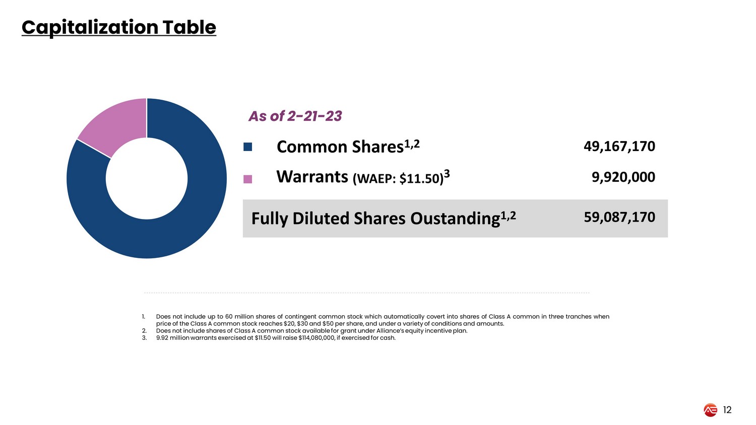 Capitalization Table 12 59,087,170 1. Does not include up to 60 million shares of contingent common stock which automatically covert into shares of Class A common in three tranches when price of the Class A common stock reaches $ 20 , $ 30 and $ 50 per share, and under a variety of conditions and amounts . 2. Does not include shares of Class A common stock available for grant under Alliance’s equity incentive plan . 3. 9 . 92 million warrants exercised at $ 11 . 50 will raise $ 114 , 080 , 000 , if exercised for cash . Common Shares 1,2 Warrants (WAEP: $11.50) 3 49,167,170 9,920,000 Fully Diluted Shares Oustanding 1,2 As of 2 - 21 - 23