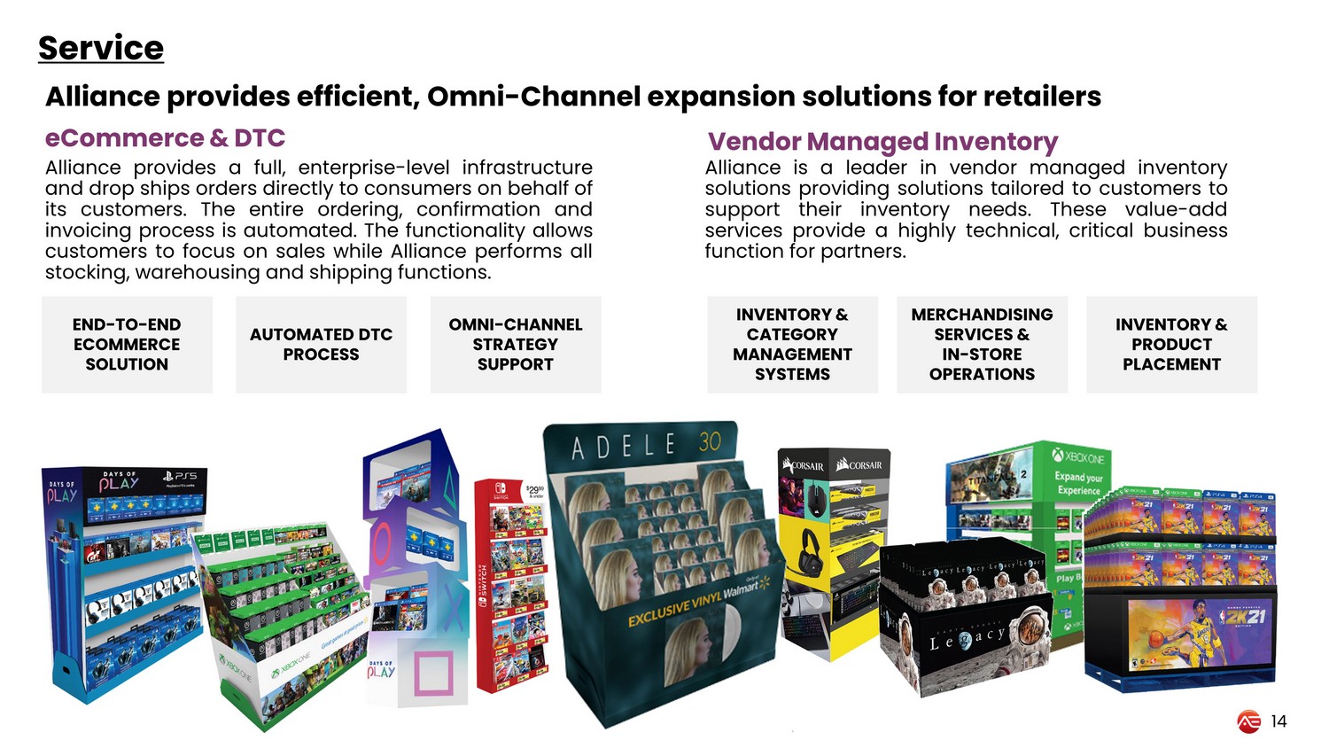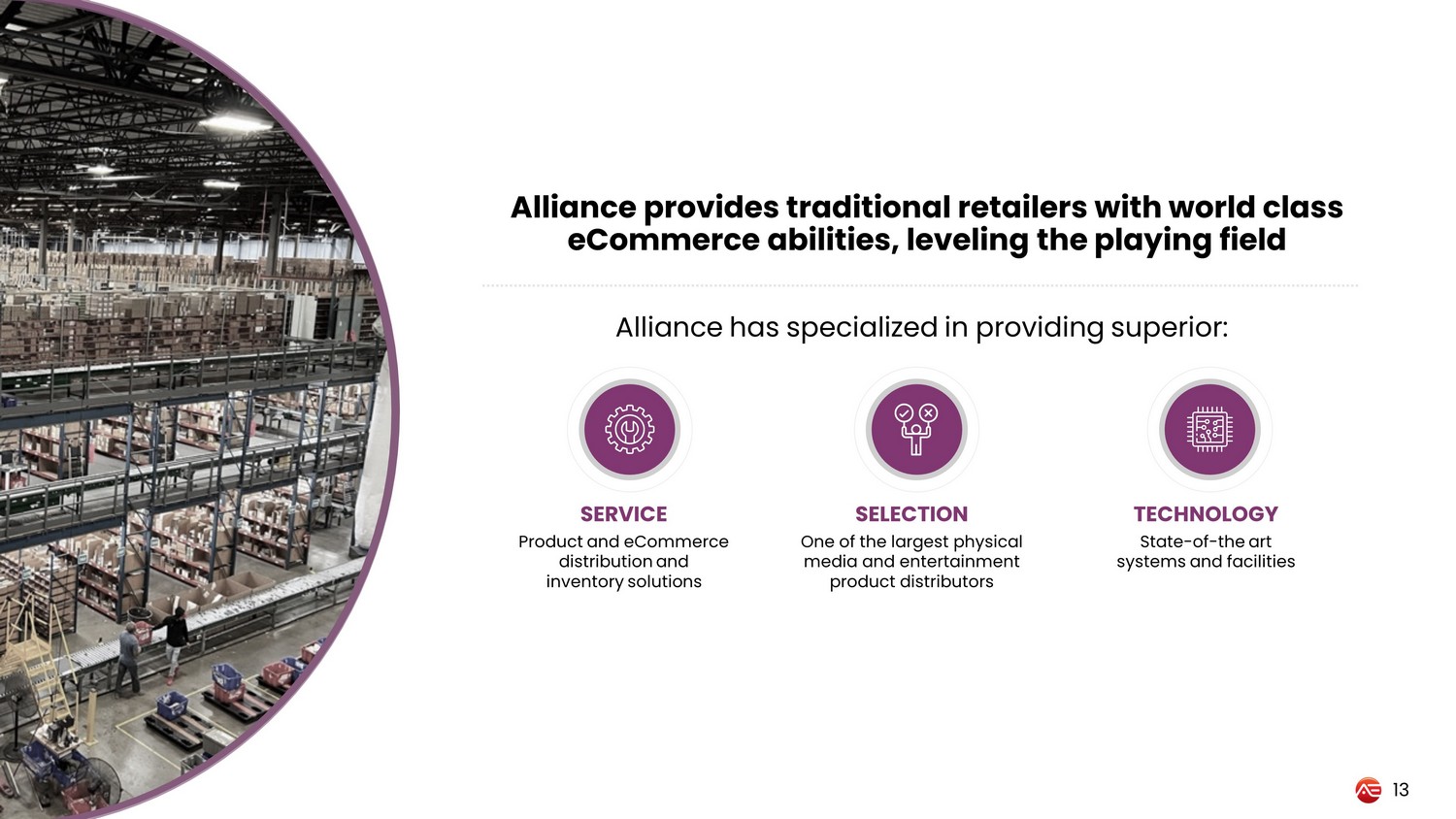 SERVICE Product and eCommerce distribution and inventory solutions TECHNOLOGY State - of - the art systems and facilities SELECTION One of the largest physical media and entertainment product distributors Alliance provides traditional retailers with world class eCommerce abilities, leveling the playing field Alliance has specialized in providing superior: 13