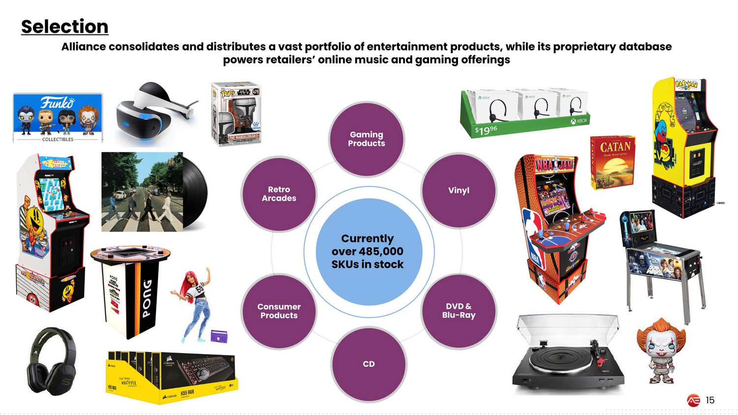 Alliance consolidates and distributes a vast portfolio of entertainment products, while its proprietary database powers retailers’ online music and gaming offerings Gaming Products DVD & Blu - Ray CD Consumer Products Currently over 485,000 SKUs in stock Selection Vinyl Retro Arcades 15