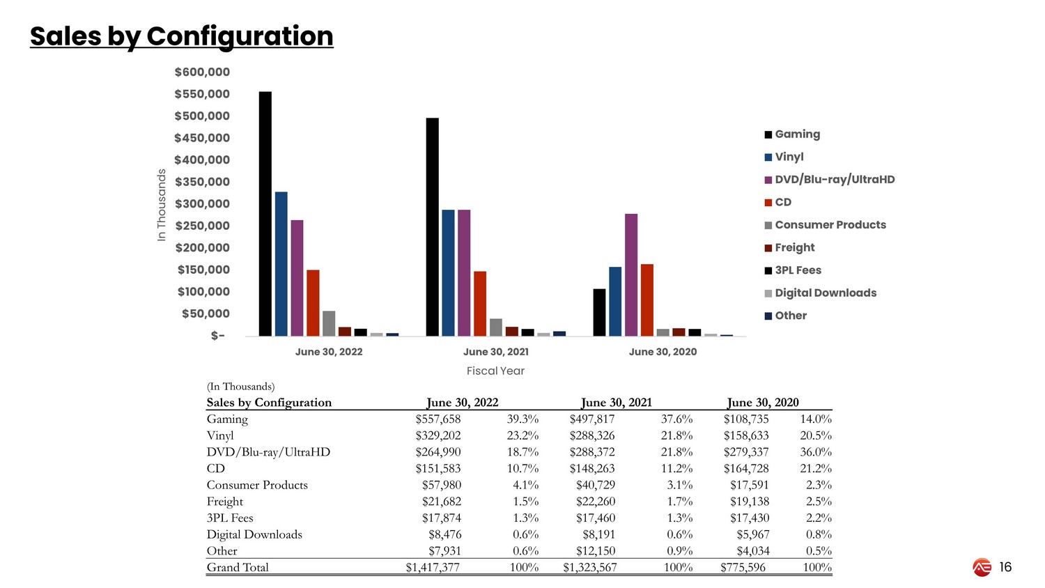 Sales by Configuration 16 (In Thousands) Sales by Configuration June 30, 2022 June 30, 2021 June 30, 2020 Gaming $557,658 39.3% $497,817 37.6% $108,735 14.0% Vinyl $329,202 23.2% $288,326 21.8% $158,633 20.5% DVD/Blu - ray/UltraHD $264,990 18.7% $288,372 21.8% $279,337 36.0% CD $151,583 10.7% $148,263 11.2% $164,728 21.2% Consumer Products $57,980 4.1% $40,729 3.1% $17,591 2.3% Freight $21,682 1.5% $22,260 1.7% $19,138 2.5% 3PL Fees $17,874 1.3% $17,460 1.3% $17,430 2.2% Digital Downloads $8,476 0.6% $8,191 0.6% $5,967 0.8% Other $7,931 0.6% $12,150 0.9% $4,034 0.5% Grand Total $1,417,377 100% $1,323,567 100% $775,596 100% $- $50,000 $100,000 $150,000 $200,000 $250,000 $300,000 $350,000 $400,000 $450,000 $500,000 $550,000 $600,000 June 30, 2022 June 30, 2021 June 30, 2020 In Thousands Fiscal Year Gaming Vinyl DVD/Blu-ray/UltraHD CD Consumer Products Freight 3PL Fees Digital Downloads Other