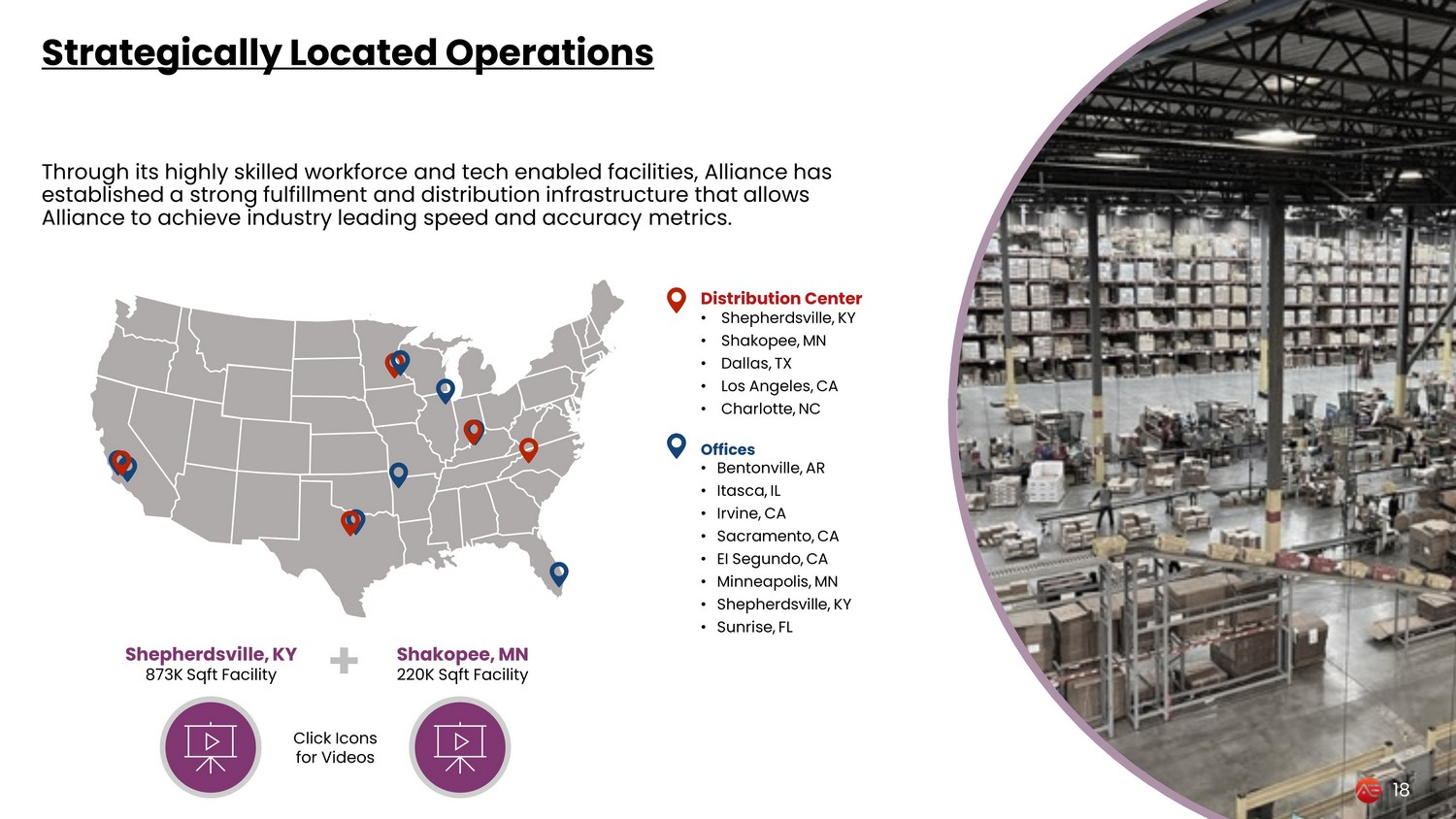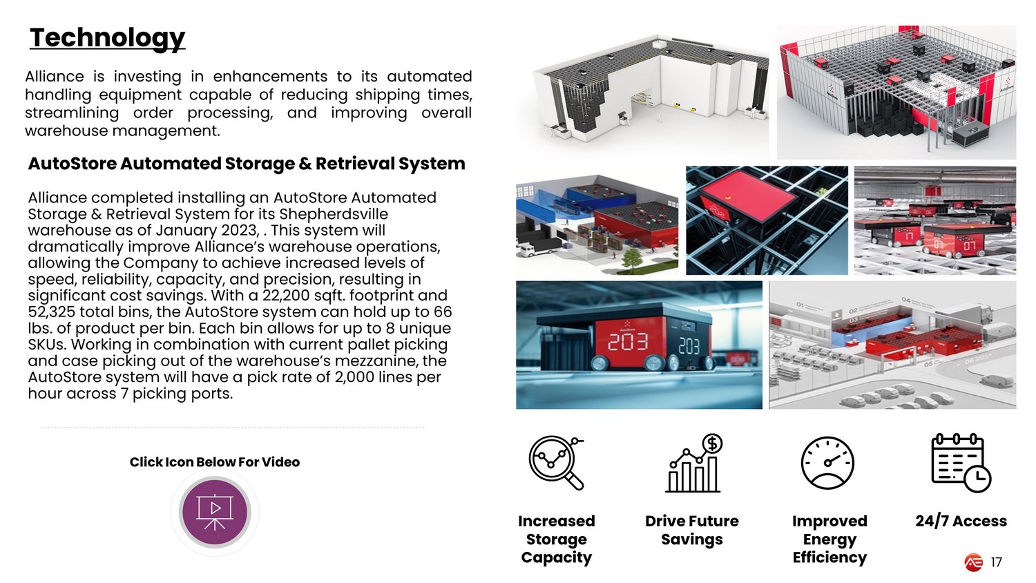 AutoStore Automated Storage & Retrieval System Alliance completed installing an AutoStore Automated Storage & Retrieval System for its Shepherdsville warehouse as of January 2023, . This system will dramatically improve Alliance’s warehouse operations, allowing the Company to achieve increased levels of speed, reliability, capacity, and precision, resulting in significant cost savings. With a 22,200 sqft. footprint and 52,325 total bins, the AutoStore system can hold up to 66 lbs. of product per bin. Each bin allows for up to 8 unique SKUs. Working in combination with current pallet picking and case picking out of the warehouse’s mezzanine, the AutoStore system will have a pick rate of 2,000 lines per hour across 7 picking ports. Increased Storage Capacity 24/7 Access Improved Energy Efficiency Drive Future Savings Alliance is investing in enhancements to its automated handling equipment capable of reducing shipping times, streamlining order processing, and improving overall warehouse management . Technology Click Icon Below For Video 17