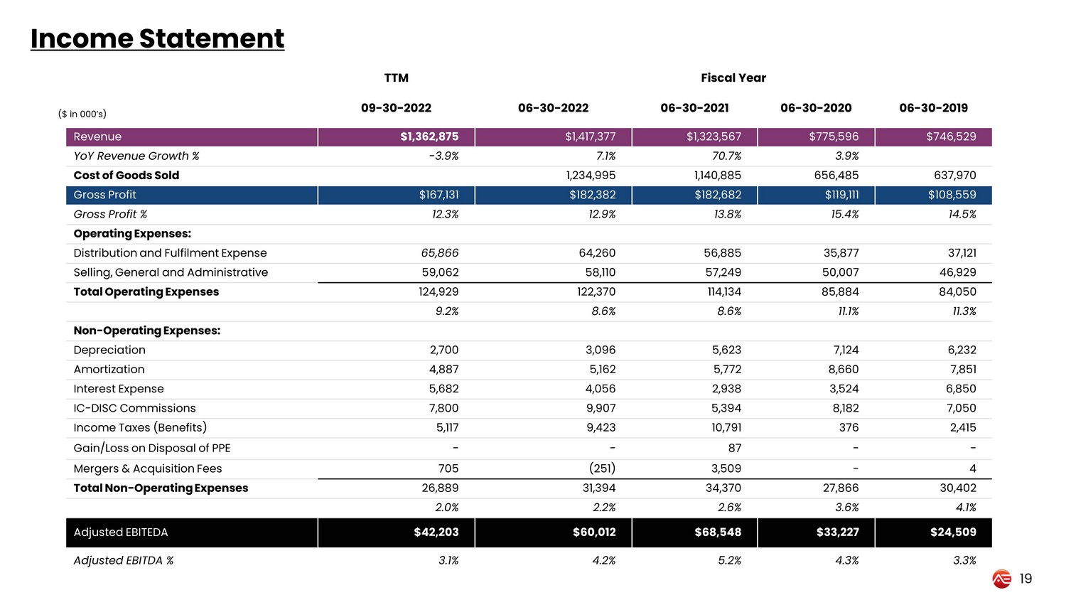TTM Fiscal Year 09 - 30 - 2022 06 - 30 - 2022 06 - 30 - 2021 06 - 30 - 2020 06 - 30 - 2019 Revenue $1,362,875 $1,417,377 $1,323,567 $775,596 $746,529 YoY Revenue Growth % - 3.9% 7.1% 70.7% 3.9% Cost of Goods Sold 1,234,995 1,140,885 656,485 637,970 Gross Profit $167,131 $182,382 $182,682 $119,111 $108,559 Gross Profit % 12.3% 12.9% 13.8% 15.4% 14.5% Operating Expenses: Distribution and Fulfilment Expense 65,866 64,260 56,885 35,877 37,121 Selling, General and Administrative 59,062 58,110 57,249 50,007 46,929 Total Operating Expenses 124,929 122,370 114,134 85,884 84,050 9.2% 8.6% 8.6% 11.1% 11.3% Non - Operating Expenses: Depreciation 2,700 3,096 5,623 7,124 6,232 Amortization 4,887 5,162 5,772 8,660 7,851 Interest Expense 5,682 4,056 2,938 3,524 6,850 IC - DISC Commissions 7,800 9,907 5,394 8,182 7,050 Income Taxes (Benefits) 5,117 9,423 10,791 376 2,415 Gain/Loss on Disposal of PPE - - 87 - - Mergers & Acquisition Fees 705 (251) 3,509 - 4 Total Non - Operating Expenses 26,889 31,394 34,370 27,866 30,402 2.0% 2.2% 2.6% 3.6% 4.1% Adjusted EBITEDA $42,203 $60,012 $68,548 $33,227 $24,509 Adjusted EBITDA % 3.1% 4.2% 5.2% 4.3% 3.3% 19 Income Statement ($ in 000’s)