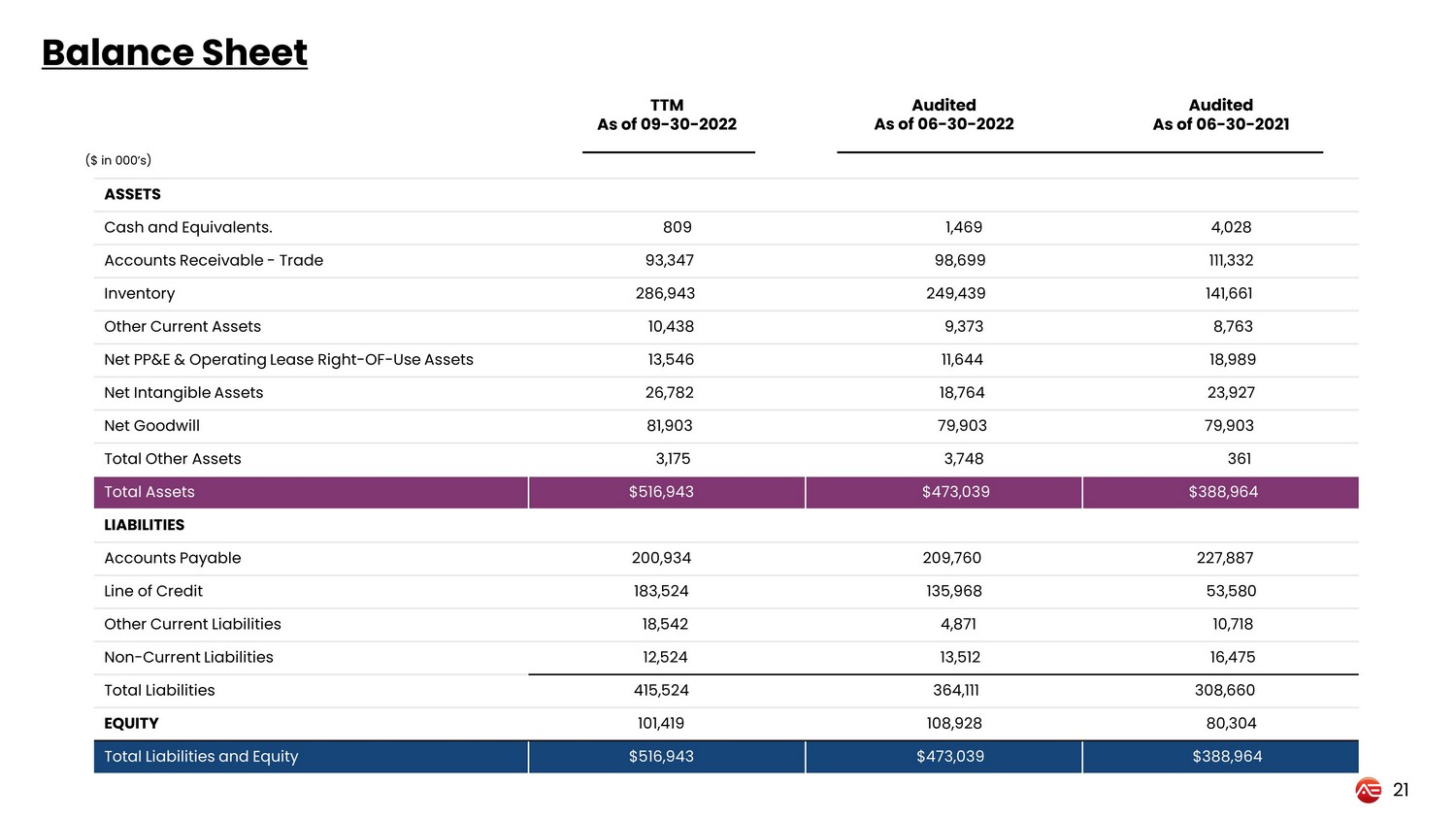 TTM As of 09 - 30 - 2022 Audited As of 06 - 30 - 2022 Audited As of 06 - 30 - 2021 ASSETS Cash and Equivalents. 809 1,469 4,028 Accounts Receivable - Trade 93,347 98,699 111,332 Inventory 286,943 249,439 141,661 Other Current Assets 10,438 9,373 8,763 Net PP&E & Operating Lease Right - OF - Use Assets 13,546 11,644 18,989 Net Intangible Assets 26,782 18,764 23,927 Net Goodwill 81,903 79,903 79,903 Total Other Assets 3,175 3,748 361 Total Assets $516,943 $473,039 $388,964 LIABILITIES Accounts Payable 200,934 209,760 227,887 Line of Credit 183,524 135,968 53,580 Other Current Liabilities 18,542 4,871 10,718 Non - Current Liabilities 12,524 13,512 16,475 Total Liabilities 415,524 364,111 308,660 EQUITY 101,419 108,928 80,304 Total Liabilities and Equity $516,943 $473,039 $388,964 ($ in 000’s) 21 Balance Sheet