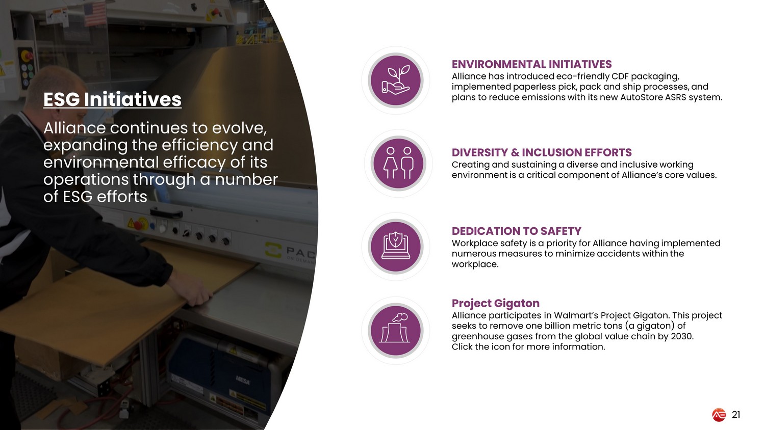 ENVIRONMENTAL INITIATIVES Alliance has introduced eco - friendly CDF packaging, implemented paperless pick, pack and ship processes, and plans to reduce emissions with its new AutoStore ASRS system. DIVERSITY & INCLUSION EFFORTS Creating and sustaining a diverse and inclusive working environment is a critical component of Alliance’s core values. DEDICATION TO SAFETY Workplace safety is a priority for Alliance having implemented numerous measures to minimize accidents within the workplace. Project Gigaton Alliance participates in Walmart’s Project Gigaton. This project seeks to remove one billion metric tons (a gigaton) of greenhouse gases from the global value chain by 2030. Click the icon for more information. ESG Initiatives Alliance continues to evolve, expanding the efficiency and environmental efficacy of its operations through a number of ESG efforts 21