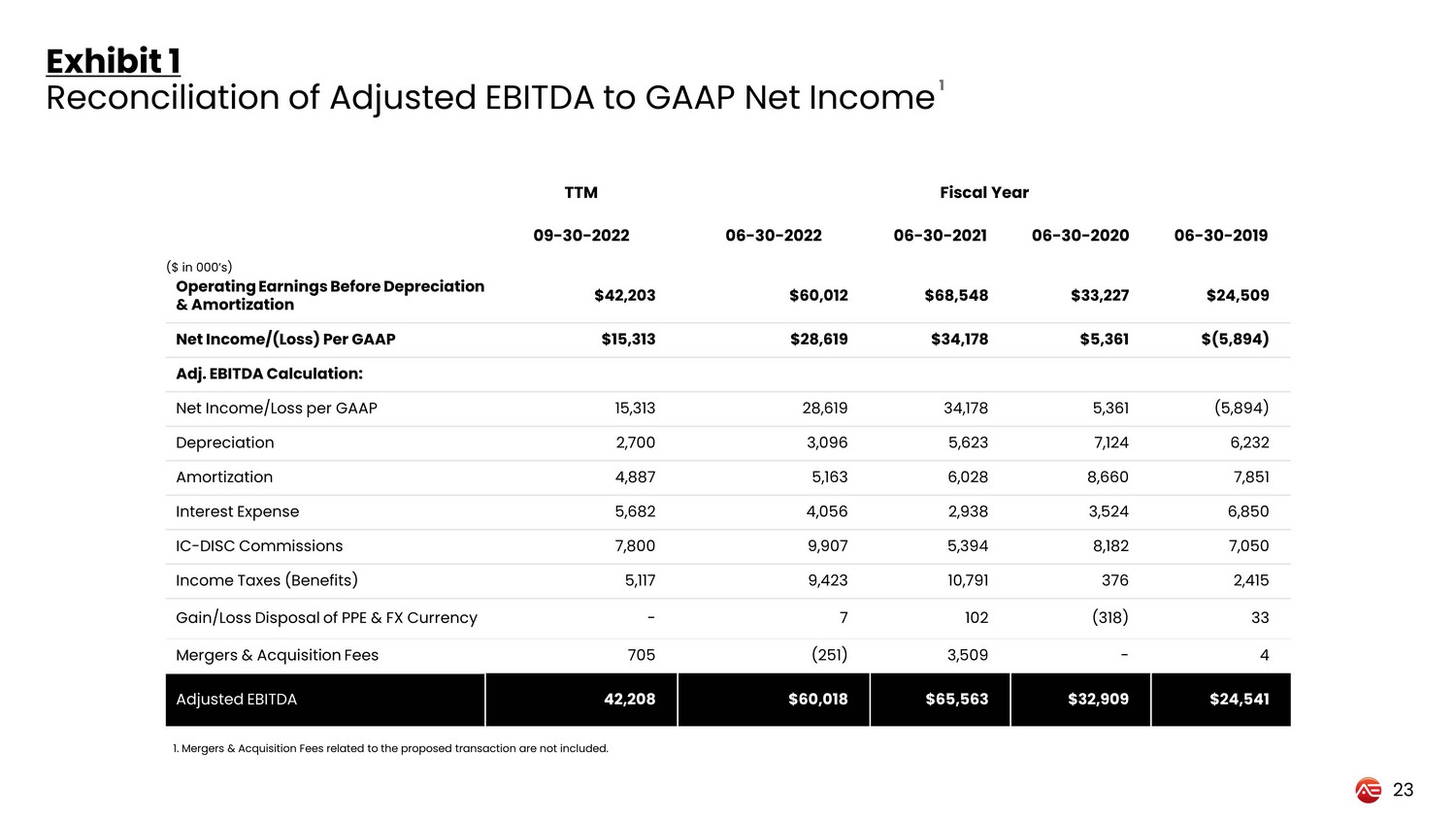 Exhibit 1 Reconciliation of Adjusted EBITDA to GAAP Net Income TTM Fiscal Year 09 - 30 - 2022 06 - 30 - 2022 06 - 30 - 2021 06 - 30 - 2020 06 - 30 - 2019 Operating Earnings Before Depreciation & Amortization $42,203 $60,012 $68,548 $33,227 $24,509 Net Income/(Loss) Per GAAP $15,313 $28,619 $34,178 $5,361 $(5,894) Adj. EBITDA Calculation: Net Income/Loss per GAAP 15,313 28,619 34,178 5,361 (5,894) Depreciation 2,700 3,096 5,623 7,124 6,232 Amortization 4,887 5,163 6,028 8,660 7,851 Interest Expense 5,682 4,056 2,938 3,524 6,850 IC - DISC Commissions 7,800 9,907 5,394 8,182 7,050 Income Taxes (Benefits) 5,117 9,423 10,791 376 2,415 Gain/Loss Disposal of PPE & FX Currency - 7 102 (318) 33 Mergers & Acquisition Fees 705 (251) 3,509 - 4 Adjusted EBITDA 42,208 $60,018 $65,563 $32,909 $24,541 1. Mergers & Acquisition Fees related to the proposed transaction are not included. 1 23 ($ in 000’s )