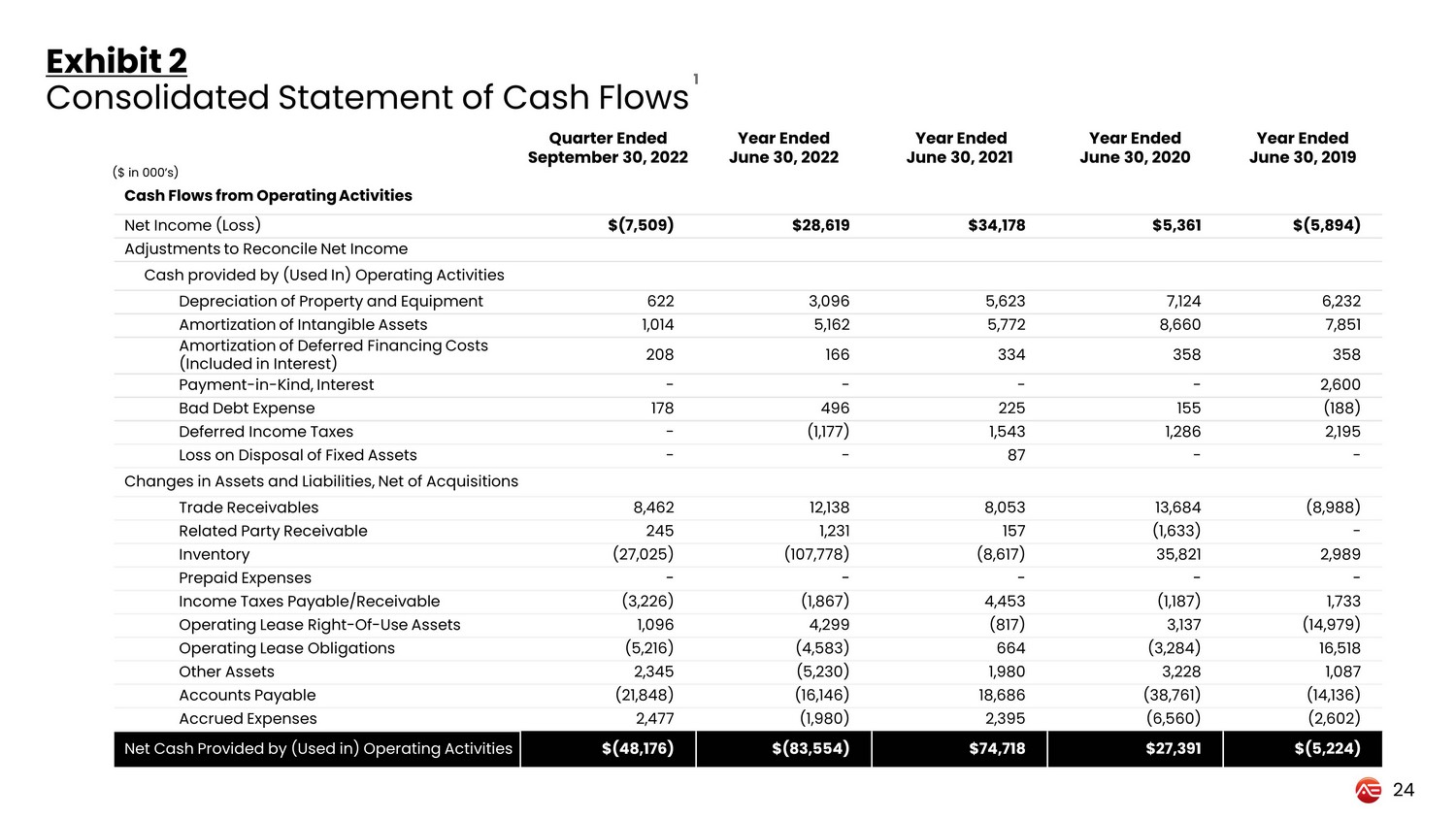 Quarter Ended September 30, 2022 Year Ended June 30, 2022 Year Ended June 30, 2021 Year Ended June 30, 2020 Year Ended June 30, 2019 Cash Flows from Operating Activities Net Income (Loss) $(7,509) $28,619 $34,178 $5,361 $(5,894) Adjustments to Reconcile Net Income Cash provided by (Used In) Operating Activities Depreciation of Property and Equipment 622 3,096 5,623 7,124 6,232 Amortization of Intangible Assets 1,014 5,162 5,772 8,660 7,851 Amortization of Deferred Financing Costs (Included in Interest) 208 166 334 358 358 Payment - in - Kind, Interest - - - - 2,600 Bad Debt Expense 178 496 225 155 (188) Deferred Income Taxes - (1,177) 1,543 1,286 2,195 Loss on Disposal of Fixed Assets - - 87 - - Changes in Assets and Liabilities, Net of Acquisitions Trade Receivables 8,462 12,138 8,053 13,684 (8,988) Related Party Receivable 245 1,231 157 (1,633) - Inventory (27,025) (107,778) (8,617) 35,821 2,989 Prepaid Expenses - - - - - Income Taxes Payable/Receivable (3,226) (1,867) 4,453 (1,187) 1,733 Operating Lease Right - Of - Use Assets 1,096 4,299 (817) 3,137 (14,979) Operating Lease Obligations (5,216) (4,583) 664 (3,284) 16,518 Other Assets 2,345 (5,230) 1,980 3,228 1,087 Accounts Payable (21,848) (16,146) 18,686 (38,761) (14,136) Accrued Expenses 2,477 (1,980) 2,395 (6,560) (2,602) Net Cash Provided by (Used in) Operating Activities $(48,176) $(83,554) $74,718 $27,391 $(5,224) Exhibit 2 Consolidated Statement of Cash Flows 1 ($ in 000’s ) 24