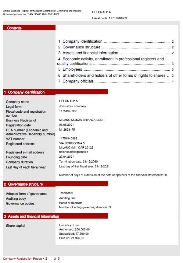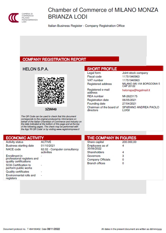 Helon started operations in April 2021 setting up it headquarter in Milano, Italy. In May 2021 we began to develop our digital platform. In August 2021 we got the process to digitally reproduce 30,000 unique tiles from a 3D scanned character and in December 2021 we started to generate tiles. The first release of our platform has been completed during the first half of 2022 and the market launch of our offering is expected at the end of 2022.