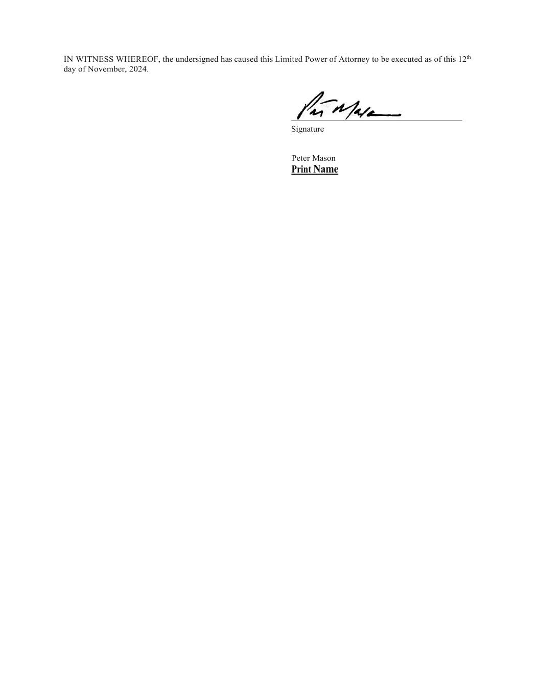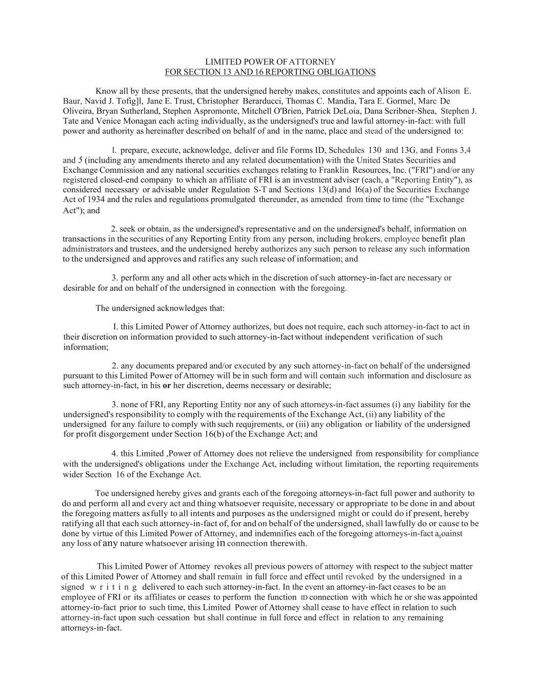LIMITED POWER OF ATTORNEY FOR SECTION 13 AND 16 REPORTING OBLIGATIONS Know all by these presents, that the undersigned hereby makes, constitutes and appoints each of Alison E. Baur, Navid J. Tofig]l, Jane E. Trust, Christopher Berarducci, Thomas C. Mandia, Tara E. Gormel, Marc De Oliveira, Bryan Sutherland, Stephen Aspromonte, Mitchell O'Brien, Patrick DeLoia, Dana Scribner-Shea, Stephen J. Tate and Venice Monagan each acting individually, as the undersigned's true and lawful attorney-in-fact: with full power and authority as hereinafter described on behalf of and in the name, place and stead of the undersigned to: l. prepare, execute, acknowledge, deliver and file Forms ID, Schedules 130 and 13G, and Fonns 3,4 and 5 (including any amendments thereto and any related documentation) with the United States Securities and Exchange Commission and any national securities exchanges relating to Franklin Resources, Inc. ("FRI") and/or any registered closed-end company to which an affiliate of FRI is an investment adviser (each, a "Reporting Entity"), as considered necessary or advisable under Regulation S-T and Sections 13(d) and l6(a) of the Securities Exchange Act of 1934 and the rules and regulations promulgated thereunder, as amended from time to time (the "Exchange Act"); and 2. seek or obtain, as the undersigned's representative and on the undersigned's behalf, information on transactions in the securities of any Reporting Entity from any person, including brokers, employee benefit plan administrators and trustees, and the undersigned hereby authorizes any such person to release any such information to the undersigned and approves and ratifies any such release of information; and 3. perform any and all other acts which in the discretion of such attorney-in-fact are necessary or desirable for and on behalf of the undersigned in connection with the foregoing. The undersigned acknowledges that: I. this Limited Power of Attorney authorizes, but does not require, each such attorney-in-fact to act in their discretion on information provided to such attorney-in-fact without independent verification of such information; 2. any documents prepared and/or executed by any such attorney-in-fact on behalf of the undersigned pursuant to this Limited Power of Attorney will be in such form and will contain such information and disclosure as such attorney-in-fact, in his or her discretion, deems necessary or desirable; 3. none of FRI, any Reporting Entity nor any of such attorneys-in-fact assumes (i) any liability for the undersigned's responsibility to comply with the requirements of the Exchange Act, (ii) any liability of the undersigned for any failure to comply with such requjrements, or (iii) any obligation or liability of the undersigned for profit disgorgement under Section 16(b) of the Exchange Act; and 4. this Limited ,Power of Attorney does not relieve the undersigned from responsibility for compliance with the undersigned's obligations under the Exchange Act, including without limitation, the reporting requirements wider Section 16 of the Exchange Act. Toe undersigned hereby gives and grants each of the foregoing attorneys-in-fact full power and authority to do and perform all and every act and thing whatsoever requisite, necessary or appropriate to be done in and about the foregoing matters as fully to all intents and purposes as the undersigned might or could do if present, hereby ratifying all that each such attorney-in-fact of, for and on behalf of the undersigned, shall lawfully do or cause to be done by virtue of this Limited Power of Attorney, and indemnifies each of the foregoing attorneys-in-fact a0oainst any loss of any nature whatsoever arising in connection therewith. This Limited Power of Attorney revokes all previous powers of attorney with respect to the subject matter of this Limited Power of Attorney and shall remain in full force and effect until revoked by the undersigned in a signed w r i t i n g delivered to each such attorney-in-fact. In the event an attorney-in-fact ceases to be an employee of FRI or its affiliates or ceases to perform the function ID connection with which he or she was appointed attorney-infact prior to such time, this Limited Power of Attorney shall cease to have effect in relation to such attorney-in-fact upon such-cessation but shall continue in full force and effect in relation to any remaining attorneys-in-fact.