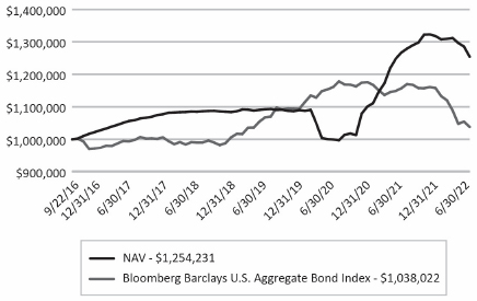 The graph below illustrates the growth of a hypothetical $1,000,000 investment assuming the purchase of common shares at the NAV of $25.00 on September 22, 2016 (commencement of operations) and tracking its progress through June 30, 2022.