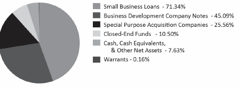 The Fund allocated 44% of its portfolio to small business whole loans originated by Square Capital. This is a unique, high income, short duration asset that we believe adds a strong degree of diversification to a portfolio of more traditional fixed income assets. Additionally, the Fund had 28% of its assets in ICD, 12% in SPACs and ~10% in CEFs and business development companies (BDCs).