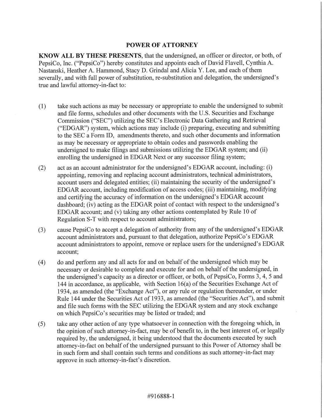 (3) (4) (5) POWER OF ATTORNEY KNOW ALL BY THESE PRESENTS, that the undersigned, an officer or director, or both, of PepsiCo, Inc. ("PepsiCo") hereby constitutes and appoints each of David Flavell, Cynthia A. Nastanski, Heather A. Hammond, Stacy D. Grindal and Alicia Y. Lee, and each of them severally, and with full power of substitution, re-substitution and delegation, the undersigned's true and lawful attorney-in-fact to: (1) take such actions as may be necessary or appropriate to enable the undersigned to submit and file forms, schedules and other documents with the U.S. Securities and Exchange Commission ("SEC") utilizing the SEC's Electronic Data Gathering and Retrieval ("EDGAR") system, which actions may include (i) preparing, executing and submitting to the SEC a Form ID, amendments thereto, and such other documents and information as may be necessary or appropriate to obtain codes and passwords enabling the undersigned to make filings and submissions utilizing the EDGAR system; and (ii) enrolling the undersigned in EDGAR Next or any successor filing system; (2) act as an account administrator for the undersigned's EDGAR account, including: (i) appointing, removing and replacing account administrators, technical administrators, account users and delegated entities; (ii) maintaining the security of the undersigned's EDGAR account, including modification of access codes; (iii) maintaining, modifying and certifying the accuracy of information on the undersigned's EDGAR account dashboard; (iv) acting as the EDGAR point of contact with respect to the undersigned's EDGAR account; and (v) taking any other actions contemplated by Rule 10 of Regulation S-T with respect to account administrators; cause PepsiCo to accept a delegation of authority from any of the undersigned's EDGAR account administrators and, pursuant to that delegation, authorize PepsiCo's EDGAR account administrators to appoint, remove or replace users for the undersigned's EDGAR account; do and perform any and all acts for and on behalf of the undersigned which may be necessary or desirable to complete and execute for and on behalf of the undersigned, in the undersigned's capacity as a director or officer, or both, of PepsiCo, Forms 3, 4, 5 and 144 in accordance, as applicable, with Section 16(a) of the Securities Exchange Act of 1934, as amended (the "Exchange Act"), or any rule or regulation thereunder, or under Rule 144 under the Securities Act of 1933, as amended (the "Securities Act"), and submit and file such forms with the SEC utilizing the EDGAR system and any stock exchange on which PepsiCo's securities may be listed or traded; and take any other action of any type whatsoever in connection with the foregoing which, in the opinion of such attorney-in-fact, may be of benefit to, in the best interest of, or legally required by, the undersigned, it being understood that the documents executed by such attorney-in-fact on behalf of the undersigned pursuant to this Power of Attorney shall be in such form and shall contain such terms and conditions as such attorney-in-fact may approve in such attorney-in-fact's discretion. 4916888-1