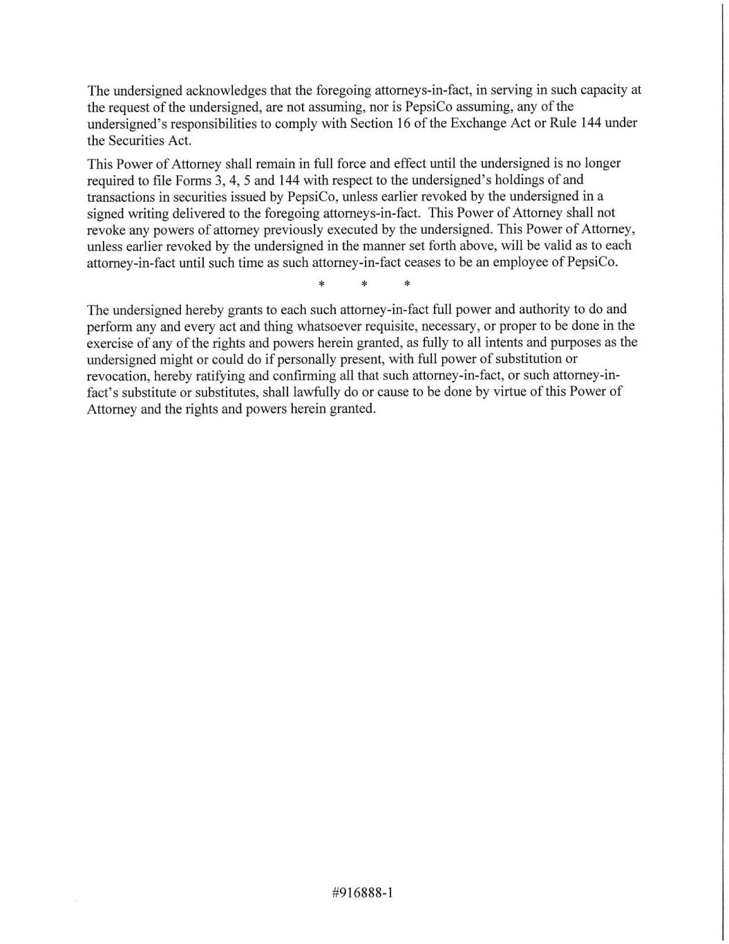 The undersigned acknowledges that the foregoing attorneys-in-fact, in serving in such capacity at the request of the undersigned, are not assuming, nor is PepsiCo assuming, any of the undersigned's responsibilities to comply with Section 16 of the Exchange Act or Rule 144 under the Securities Act. This Power of Attorney shall remain in full force and effect until the undersigned is no longer required to file Forms 3, 4, 5 and 144 with respect to the undersigned's holdings of and transactions in securities issued by PepsiCo, unless earlier revoked by the undersigned in a signed writing delivered to the foregoing attorneys-in-fact. This Power of Attorney shall not revoke any powers of attorney previously executed by the undersigned. This Power of Attorney, unless earlier revoked by the undersigned in the manner set forth above, will be valid as to each attorney-in-fact until such time as such attorney-in-fact ceases to be an employee of PepsiCo. The undersigned hereby grants to each such attorney-in-fact full power and authority to do and perform any and every act and thing whatsoever requisite, necessary, or proper to be done in the exercise of any of the rights and powers herein granted, as fully to all intents and purposes as the undersigned might or could do if personally present, with full power of substitution or revocation, hereby ratifying and confirming all that such attorney-in-fact, or such attorney-in- fact's substitute or substitutes, shall lawfully do or cause to be done by virtue of this Power of Attorney and the rights and powers herein granted. #916888-1