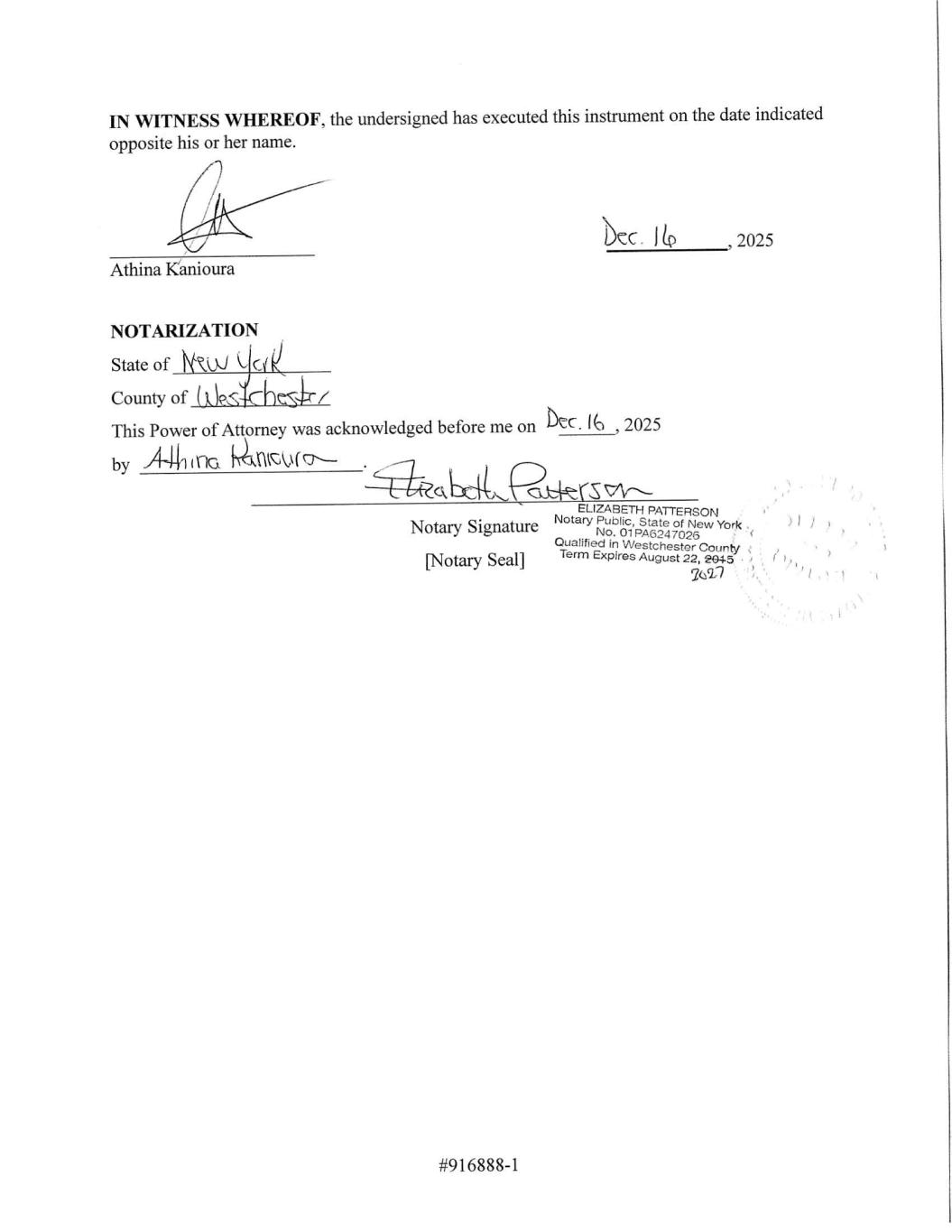IN WITNESS WHEREOF, the undersigned has executed this instrument on the date indicated opposite his or her name. Athina Kanioura NOTARIZATION State of NKW t County of Ujc-..cnzs.pir.r-/ This Power of Attorney was acknowledged before me on bec. f(-) , 2025 by A.J-11 Via A.Mkkic-— Notary Signature [Notary Seal] to ,2025 ck6d-LRKL—k(Z ELIZABETH PATTERSON Notary Public, State of New York , No. 01PA6247026 Qualified in Westchester County , Term Expires August 22, 204-5 • • 70:1 f , #916888-1