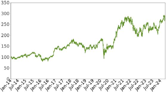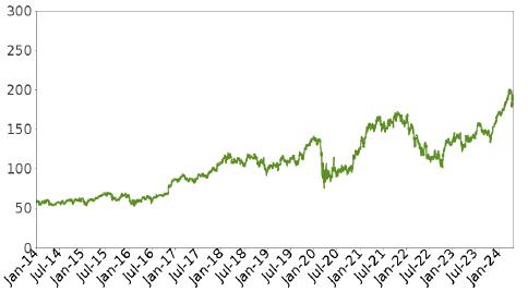 The following graph shows the daily historical performance of JPM on its primary exchange in the period from January 1, 2014 through April 25, 2024. We obtained this historical data from Bloomberg L.P. We have not independently verified the accuracy or completeness of the information obtained from Bloomberg L.P. On the pricing date, the Closing Market Price of JPM was $193.37. The graph below may have been adjusted to reflect certain corporate actions such as stock splits and reverse stock splits.